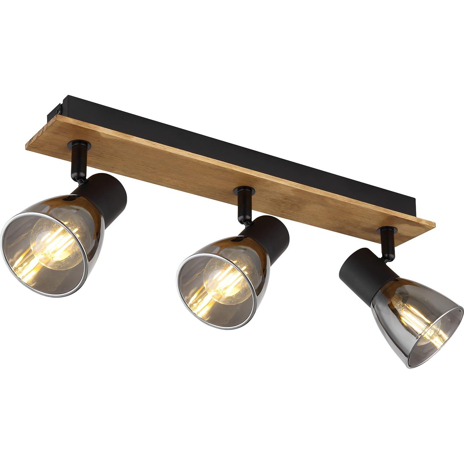 Spot en bois marron foncé, métal noir mat, verre fumé, LxlxH : 400x70x155mm, exclu 3x E14 40W 230V.