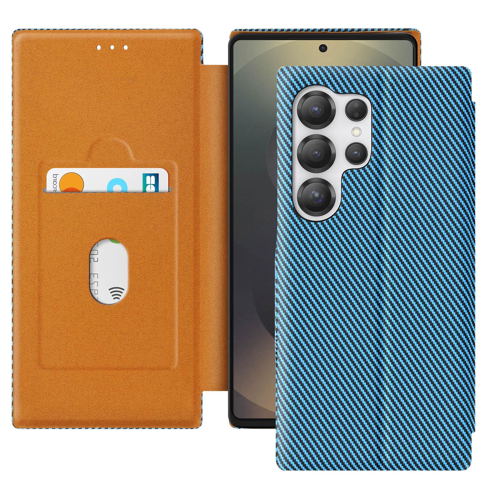 Étui folio pour Samsung Galaxy S25 Ultra. Design effet fibre de carbone. Porte-carte intégré avec protection anti-RFID. Support vidéo intégré. Fermeture magnétique sécurisée. Protection optimale contre les chocs, rayures. Mince et ergonomique avec courbure sur les bords. Accès facile aux boutons et ports.