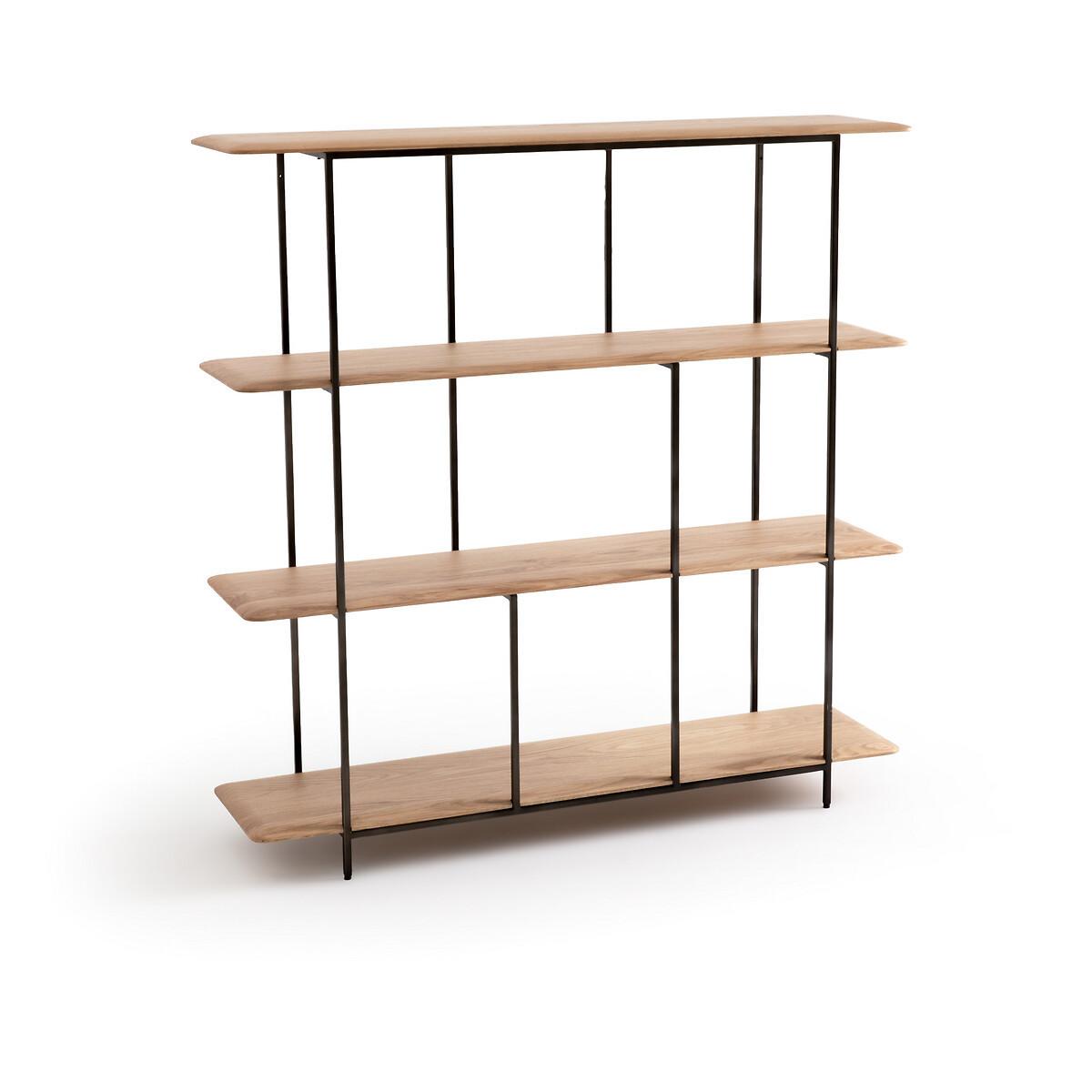 Ligne légère et graphique pour la bibliothèque Jacobson aux étagères en forme d'aile d'avion légèrement arrondies.