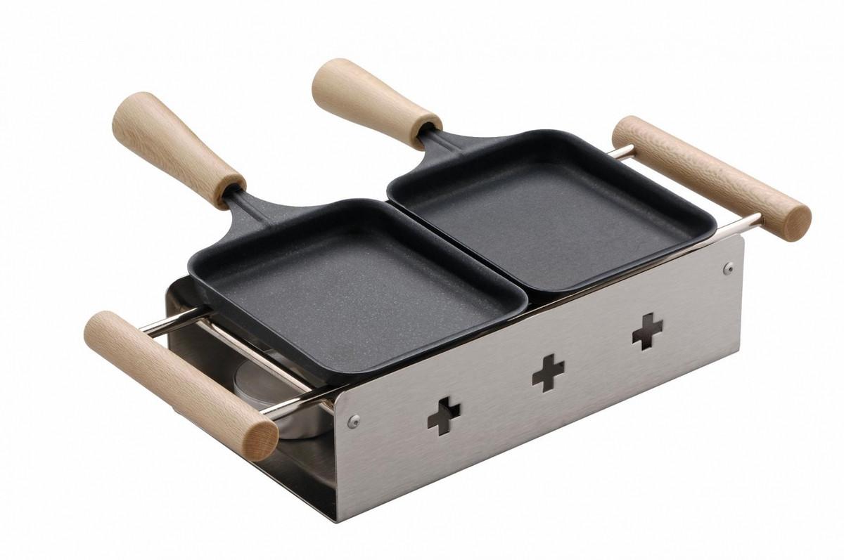 Fondeuse � raclette pour 1 � 2 personnes. Chauffage efficace gr�ce � une chaleur directe sur le fond du po�lon. Trois bougies � r�chaud par po�lon fondent le fromage � raclette dans 3 � 4 minutes seulement. Fabriqu� en acier inoxydable bross�. 2 spatules