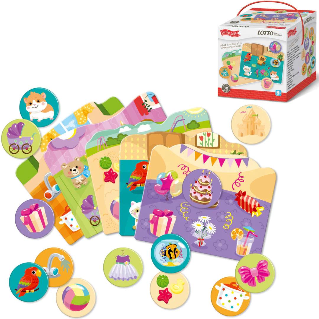 6 Felder. 36 Chips. Spaß beim Spielen! Spiel LOTTO, indem Du die Karten und Chips mit den Themen verwendest, die Dich interessieren: Haustiere. Schönheit. Zubehör. etc. Entwickle Reaktionsgeschwindigkeit und Beobachtungsgabe.