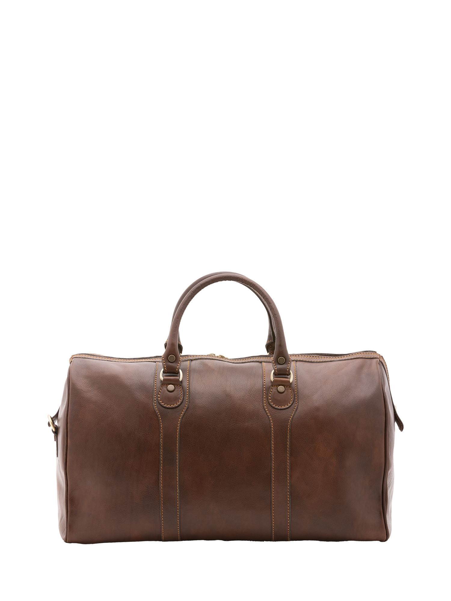 Sac de voyage unisexe. La fermeture est avec zip. Les poches intérieures sont une avec fermeture éclair. Les poches extérieures sont absentes. La bandoulière est réglable et amovible en cuir. La poignée est en cuir. Il y a un compartiment interne. Le matériau extérieur est 100 % cuir véritable. À l'intérieur, il est doublé de coton. Dimensions : 52x38x20 cm. Fabriqué en Italie