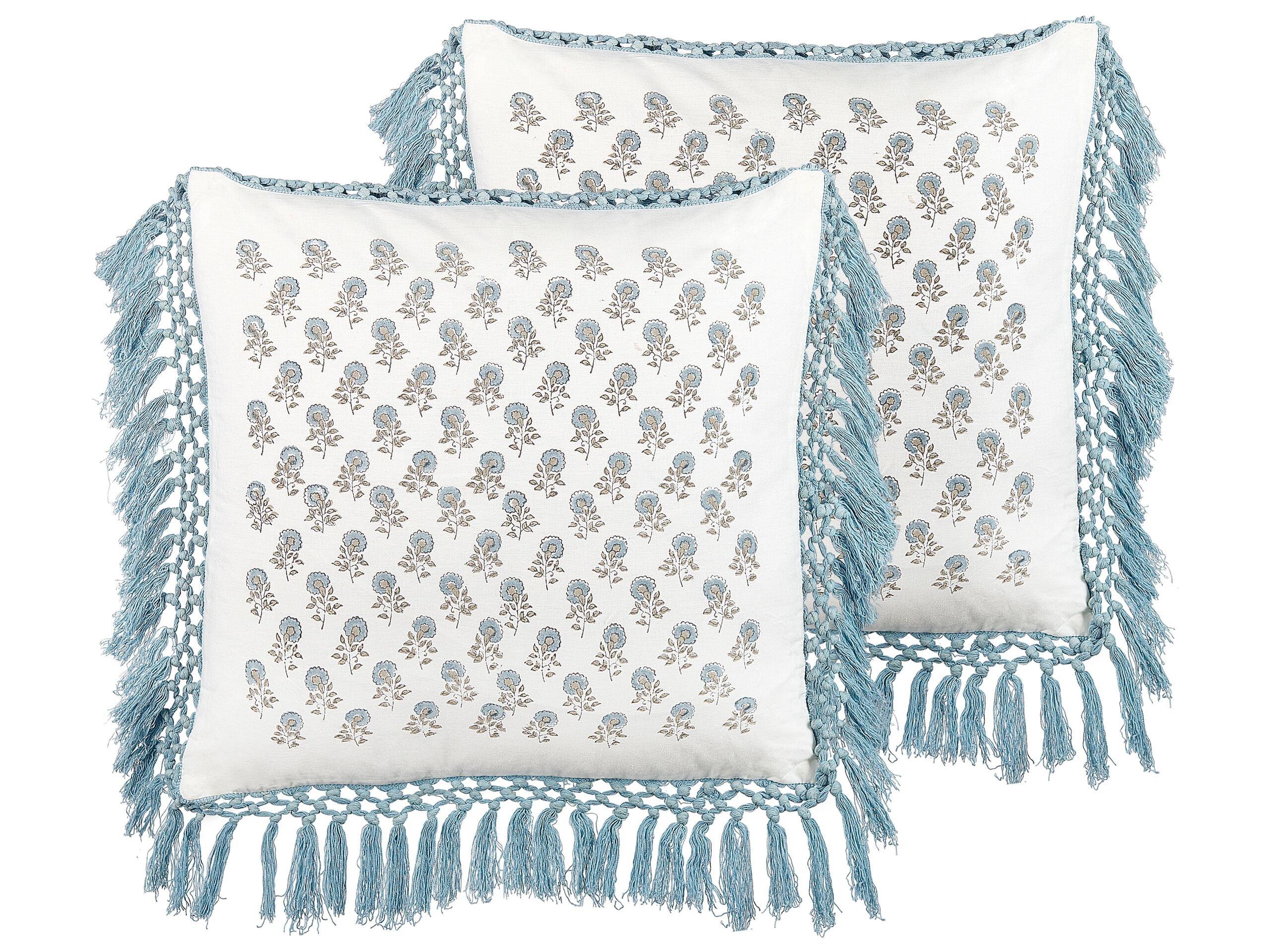 Coussins décoratifs à pompons. Donnez du charme à votre intérieur et décorez-le avec ces coussins de décoration au style romantique. La housse en coton au délicat motif floral, réalisée à la main selon la technique de l'impression en bloc, est agrémentée de bords frangés bleus. Le rembourrage doux en polyester de haute qualité peut être facilement retiré grâce à la fermeture éclair pratique.