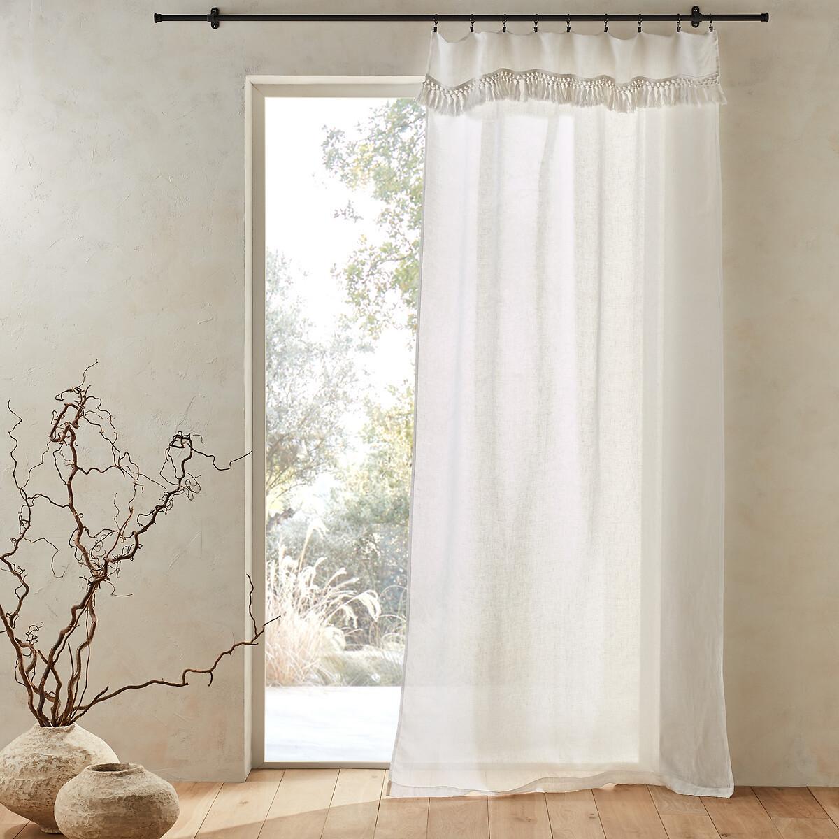 En gaze de lin, le voilage Elphir est à suspendre avec les pinces à rideaux « Loch » vendues sur le site.