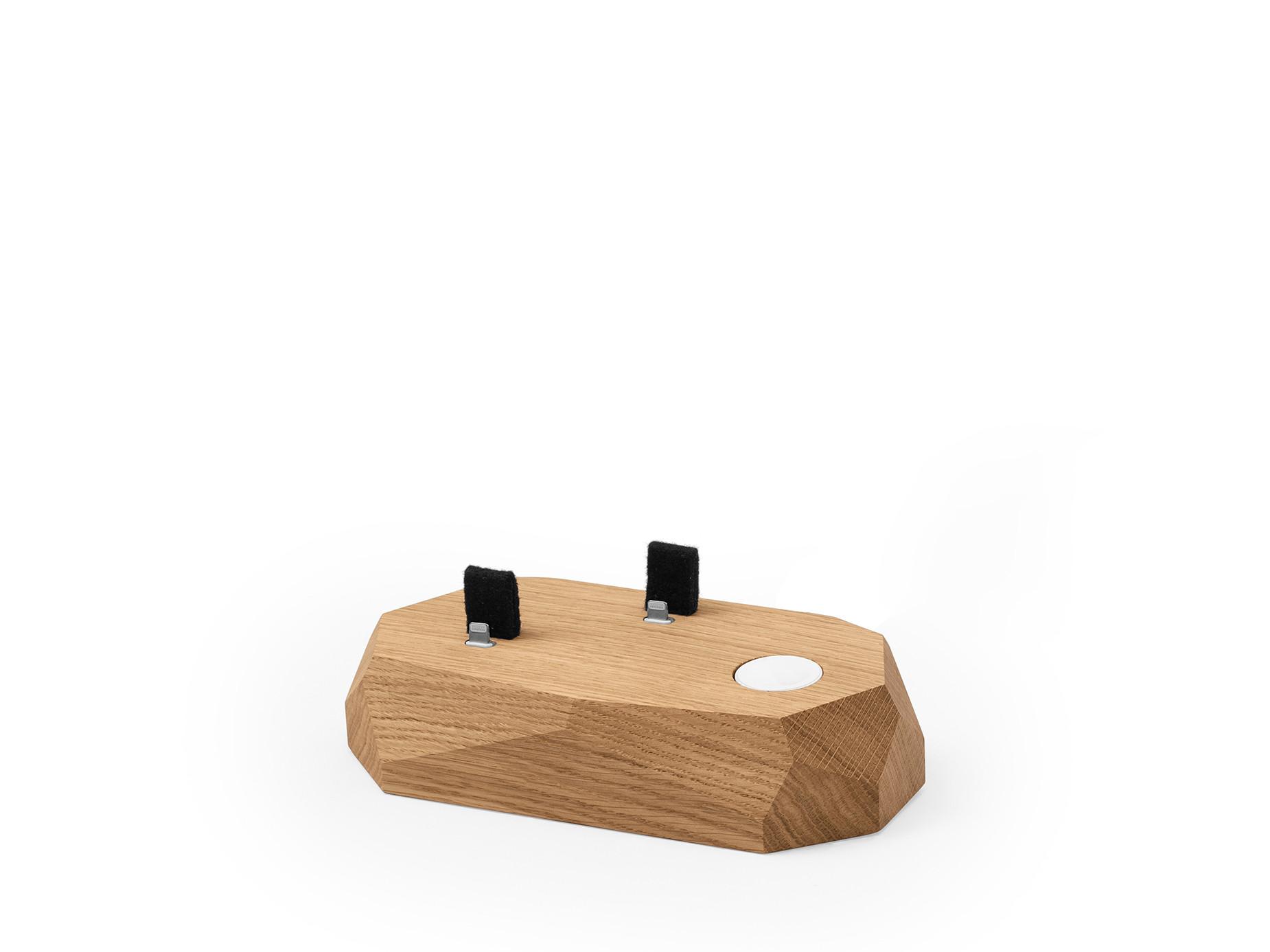La station d'accueil Triple Dock a été conçue pour ne pas donner l'impression d'être oppressante, tout en étant aussi pratique que possible. Grâce à notre technique originale de travail du bois, il nous est possible de faire ressortir les veines du bois et le bloc de bois géométrique a l'air léger et compact. La surface du chargeur est lisse et agréable au toucher, car elle a été protégée par une cire à l'huile naturelle qui n'obstrue pas les pores du bois.