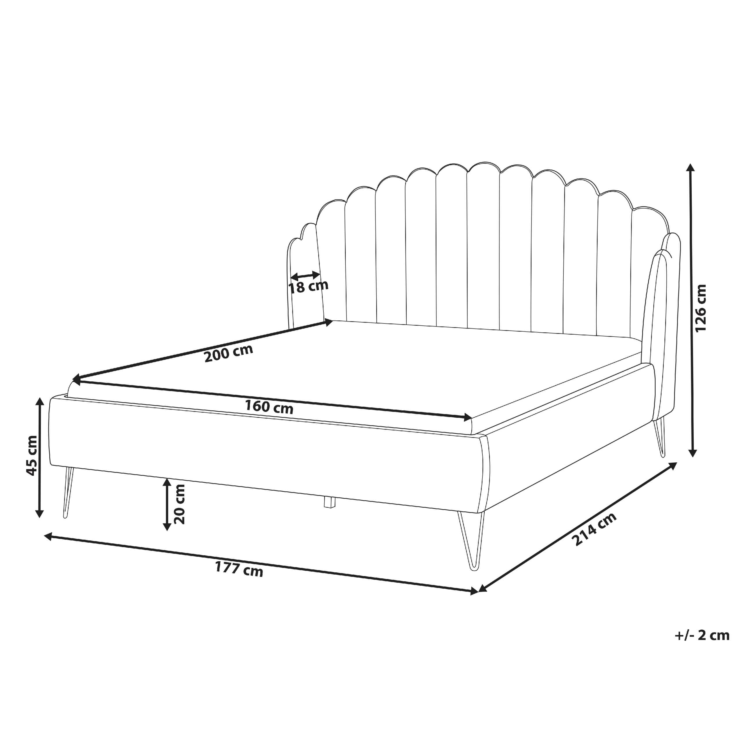Dimensions de lappuie-tête:</b> 161x106<br> <b>Largeur:</b> 177 cm<br> <b>Longueur:</b> 214 cm<br> <b>Hauteur:</b> 126 cm<br> <b>Surface de couchage:</b> 160x200 cm<br> <b>Poids:</b> 60 kg<br> <b>Charge admise:</b> 250 kg<br> <br><b>Loffre inclue: 1 x Cadre de lit, 1 x Sommier (Nombre de lattes : 30), Non inclus : matelas et parure de lit