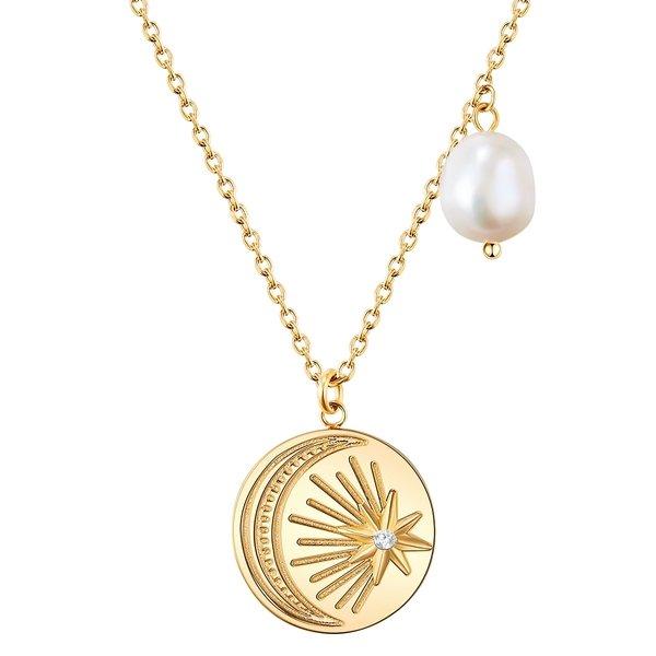 Vous voulez un accessoire qui combine la lueur de perles de perles avec un design de bijoux à la mode? Ensuite, vous fermerez cette jolie chaîne de la marque Valero Pearls dans votre coeur! Le point culminant est le médaillon avec la gravure céleste et un élément radio du cristal Preciosa. Une perle de culture d'eau douce mélangée définit un accent asymétrique passionnant. La chaîne d'ancrage et le médaillon sont en acier inoxydable et raffinés d'un parent jaune brillant chaud. Le confort confortable offre le fermoir pratique du homard et une chaîne d'extension facilitent le réglage de la longueur rapidement et facilement.