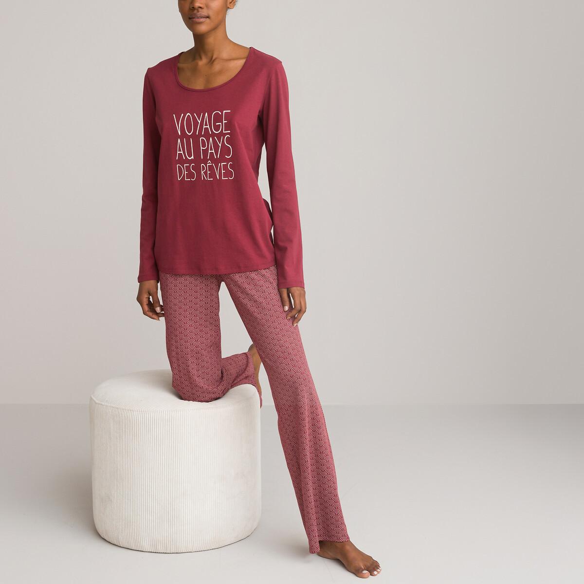 Ce pyjama à manches longues est confectionné en jersey de coton doux, offrant confort et style pour se détendre à la maison. Le haut présente une encolure ronde et un slogan imprimé, tandis que le pantalon est orné d'un motif géométrique complémentaire.