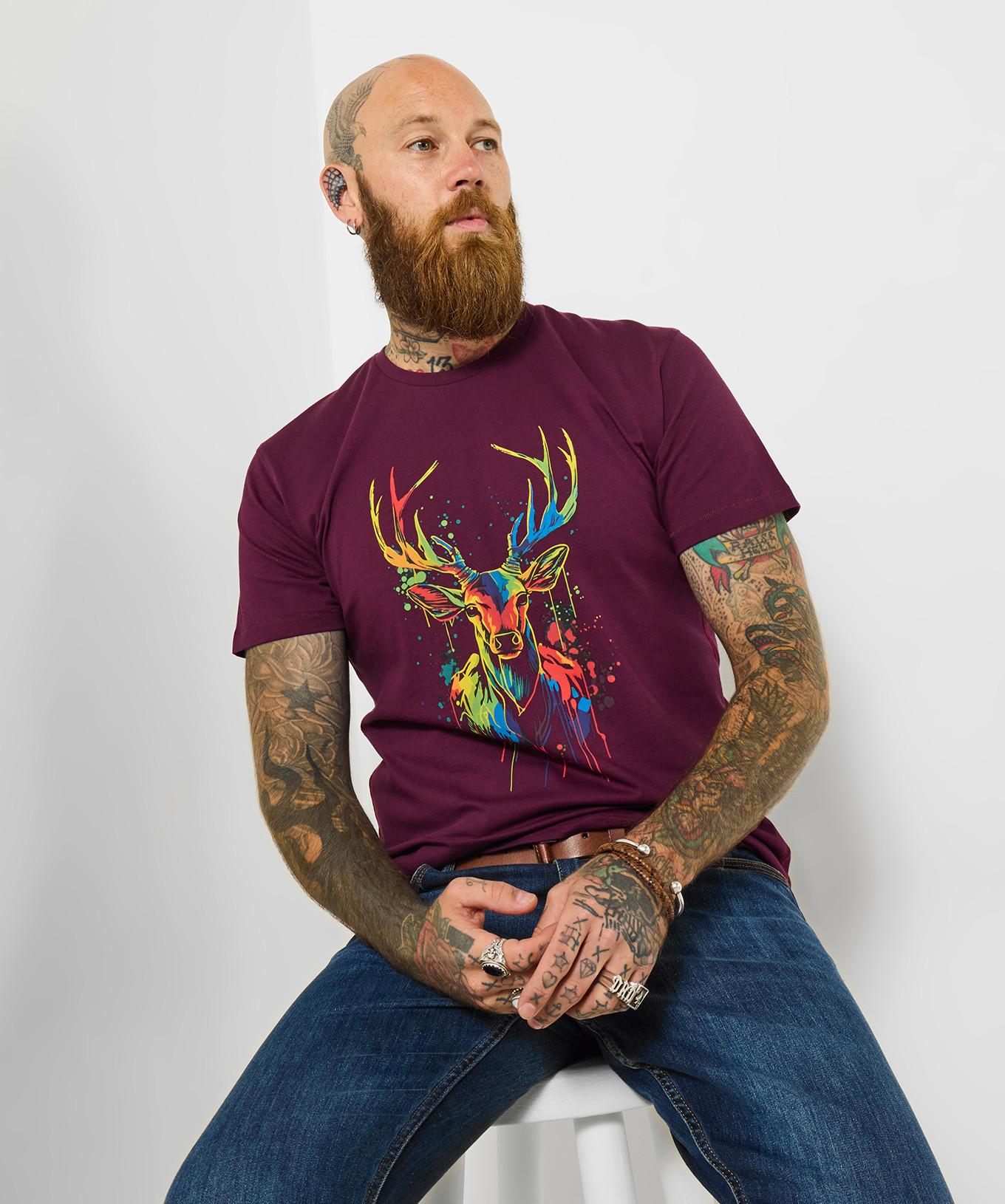Ce t-shirt avec un motif de cerf saisissant ajoute une touche unique et artistique à une garde-robe décontractée. Le design est vibrant et accrocheur, ce qui en fait une pièce remarquable pour un usage quotidien.