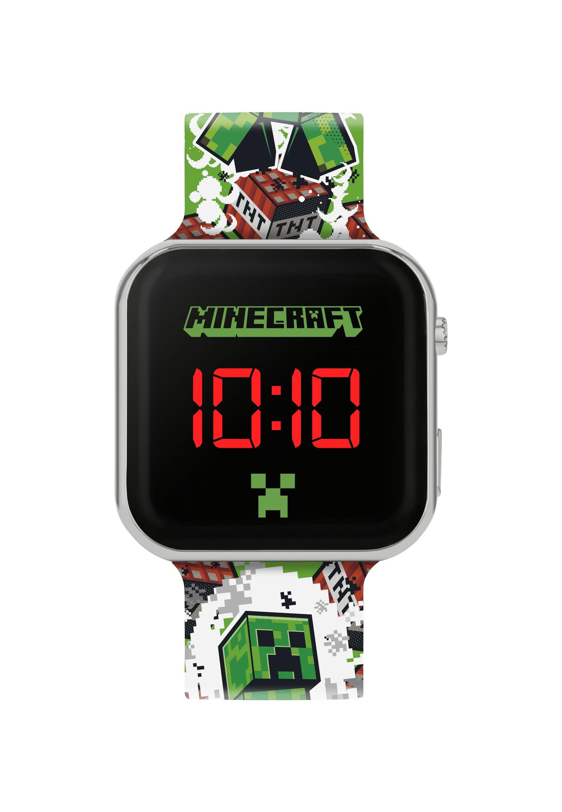 Montre LED Minecraft avec cadran Creeper, boîtier en plastique argenté, affichage numérique lumineux, fonction date et bracelet imprimé amusant avec fermeture à boucle traditionnelle. Conditionnée dans un emballage officiel de la marque.