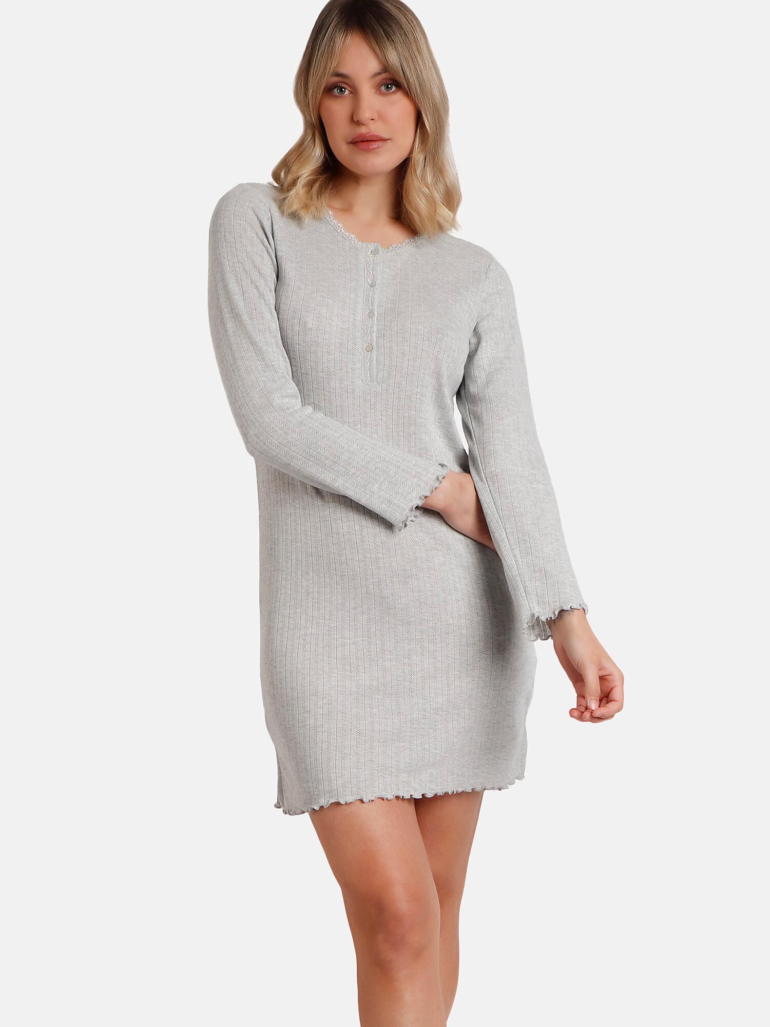 Cette chemise de nuit à manches longues Admas présente un tricot canale doux, offrant confort et une texture délicate. Le design comprend une patte de boutonnage à l'encolure et de délicats bords volantés aux manches et à l'ourlet, ajoutant un détail charmant à ce vêtement de nuit douillet. Le tissu, un mélange de coton et de viscose, est léger, très confortable et doux sur la peau.