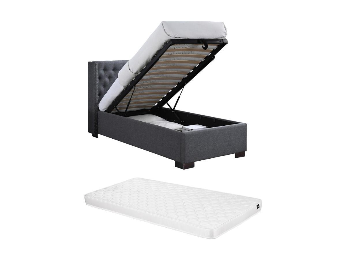 Vente-unique, Lit coffre 90 x 200 cm avec tête de lit capitonnée - Tissu - Gris + Matelas - MASSIMO