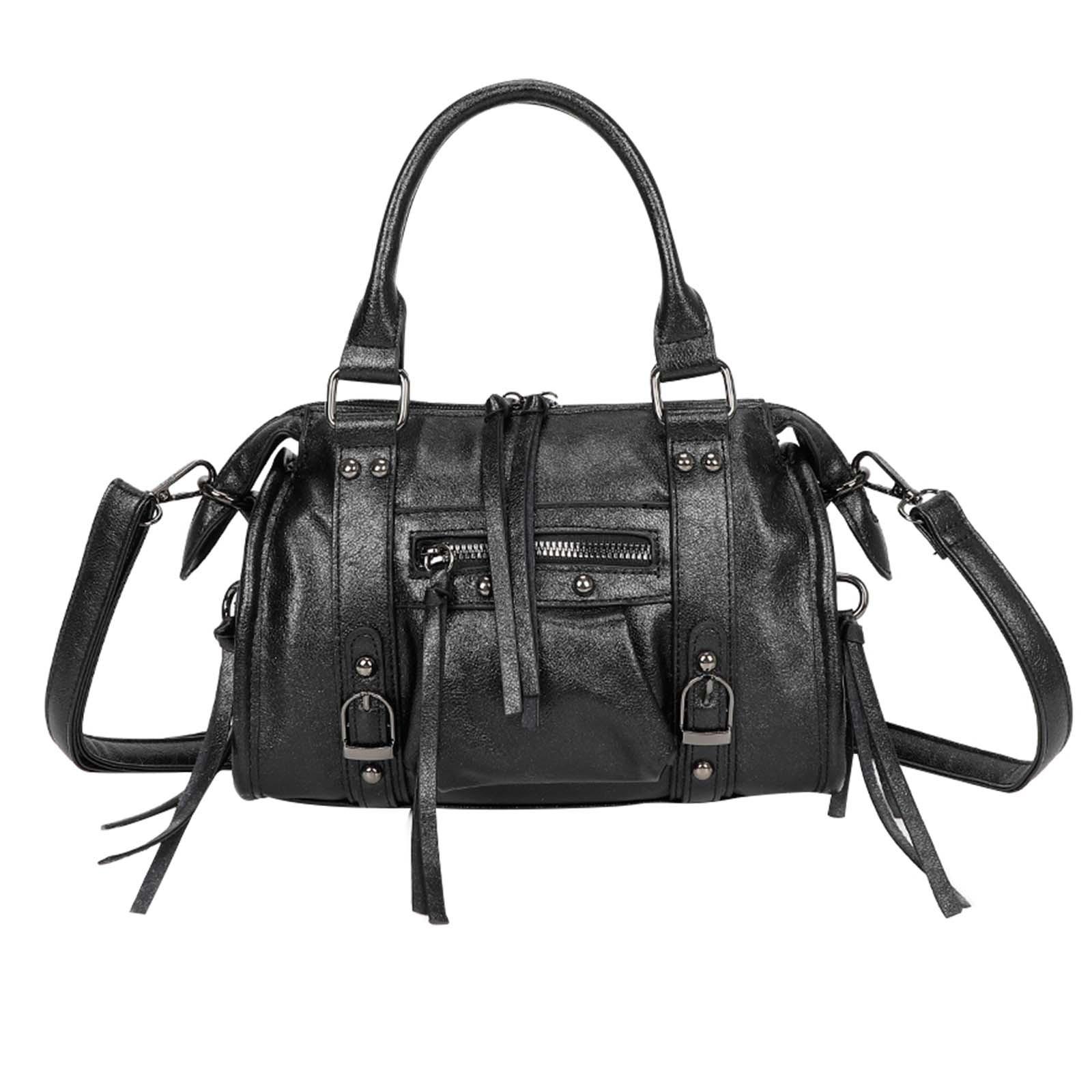 Ce sac à main élégant présente un design moderne avec de longues bandes décoratives et des accents métalliques. Il offre à la fois des poignées supérieures et une bandoulière amovible pour des options de transport polyvalentes. Le compartiment principal est sécurisé par une fermeture éclair, et des poches zippées supplémentaires à l'avant offrent un rangement pratique pour les petits objets.