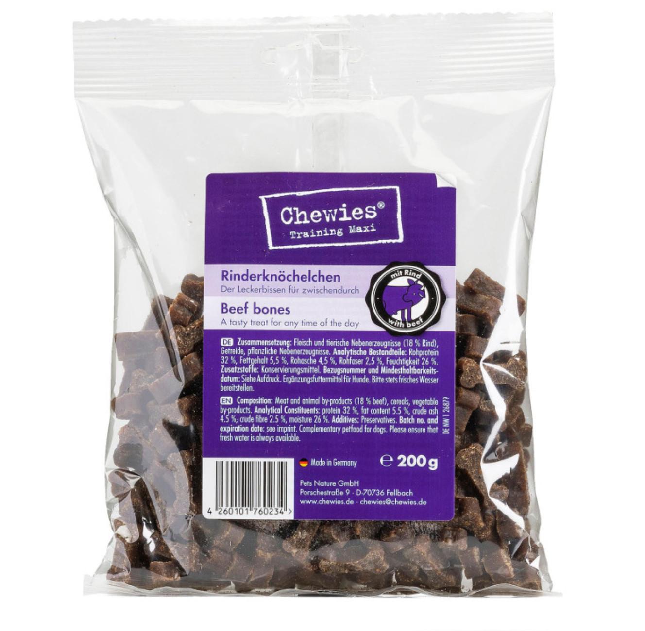 Chewies Maxi os 5x200g Les maxi os de dressage Chewies ont été développés principalement pour les moyenne à grande chiens. Grâce à leur taille et à leur texture, les Chewies Maxi sont également idéales comme friandises pour une promenade ou dans l'école canine. Ils ne s'effritent pas dans votre poche et sont très populaires auprès des chiens, de sorte que votre chien participera avec enthousiasme à la formation.