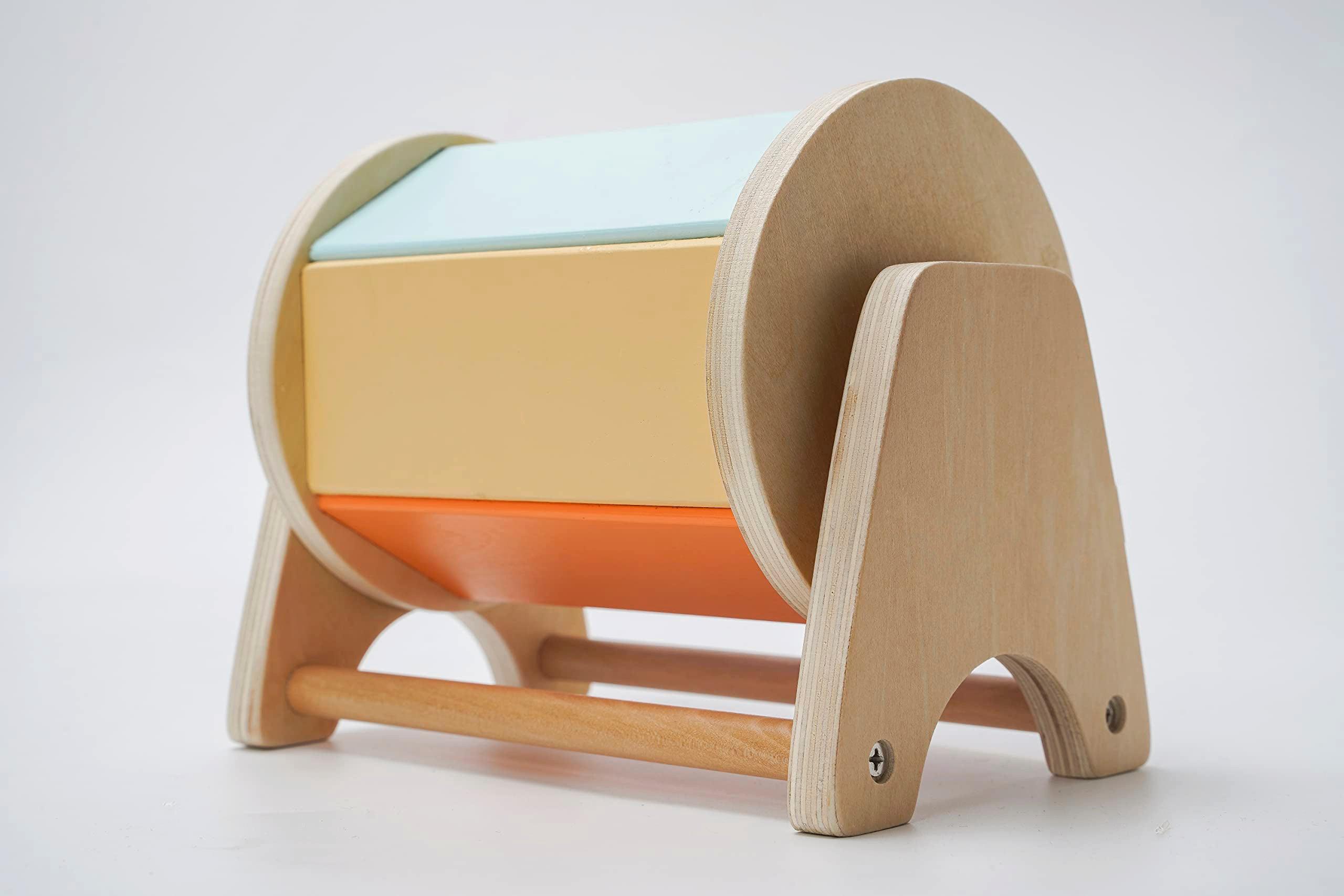 Emmenez votre bébé dans un monde d'exploration et de découverte avec ce tambour vibrant qui tourne. Le tambour coloré présente un arc-en-ciel fascinant de 5 teintes et un miroir lorsqu'il tourne sous le toucher de bébé. À l'intérieur, deux petites cloches émettent un son apaisant lorsque le tambour tourne. Le tambour qui tourne favorise la motricité globale. Les bébés sont attirés par les couleurs vives et adorent entendre le son du tambour qui tourne. Le doux mouvement de rotation aide votre enfant à développer les muscles de ses bras et de ses poignets. Il aide également les bébés à reconnaître les couleurs et stimule le développement sensoriel. Les jouets sont fabriqués avec le plus grand soin et utilisent du contreplaqué issu de l'agriculture durable. Chaque pièce a été conçue dans un souci de sécurité et de durabilité afin de garantir une expérience de jeu agréable et sûre pour toute la famille. Le tambour qui tourne encourage la motricité globale. Les bébés sont attirés par les couleurs vives et adorent entendre le son du tambour qui tourne. Le doux mouvement de rotation aide votre enfant à développer les muscles de ses bras et de ses poignets. Il aide également les bébés à reconnaître les couleurs et stimule le développement sensoriel. Le tambour arc-en-ciel est le cadeau idéal pour un petit bébé ou un jeune enfant. Offrez un cadeau qui apportera certainement de la joie aux générations à venir ! Taille-18.5 x 12.5 x 15.5 cm