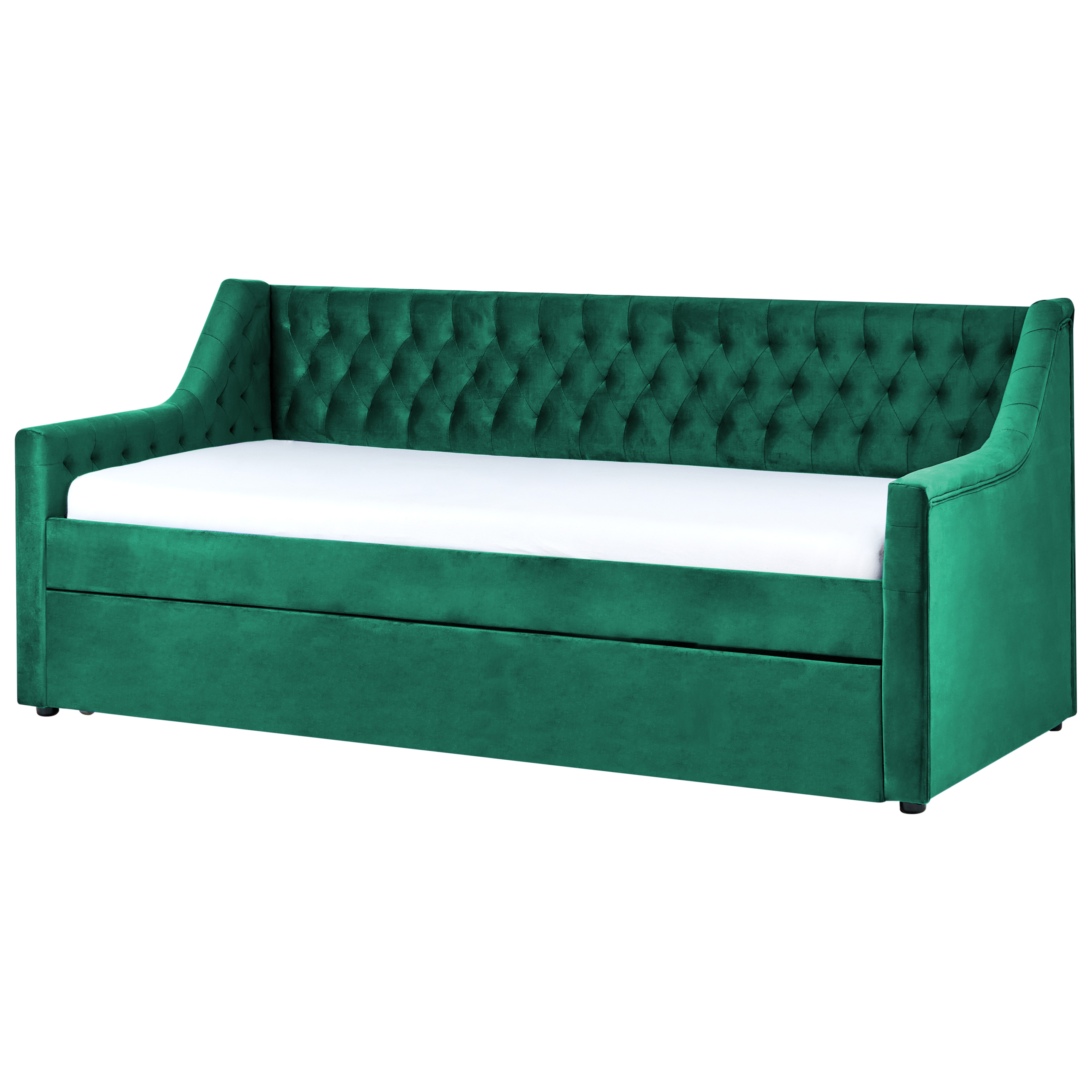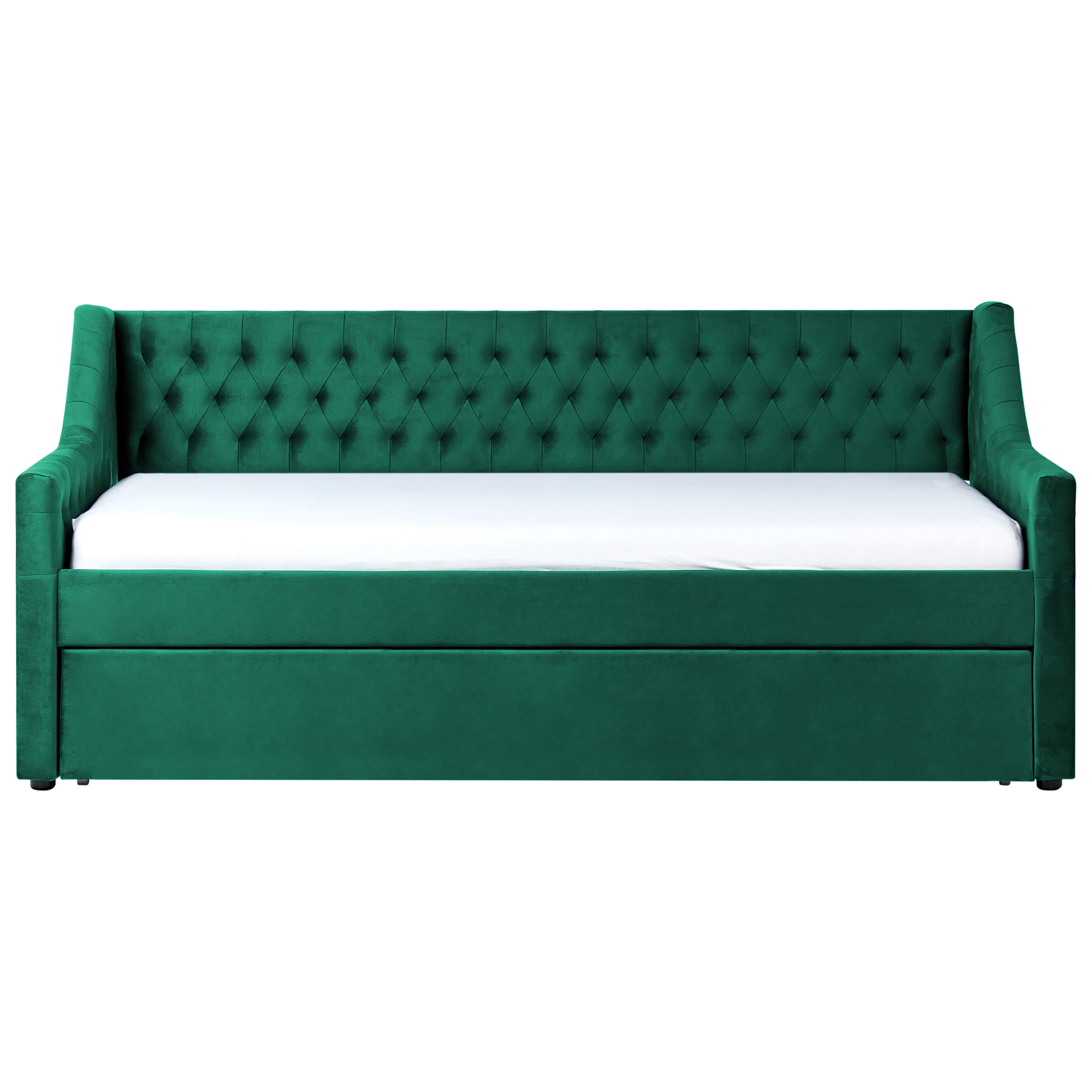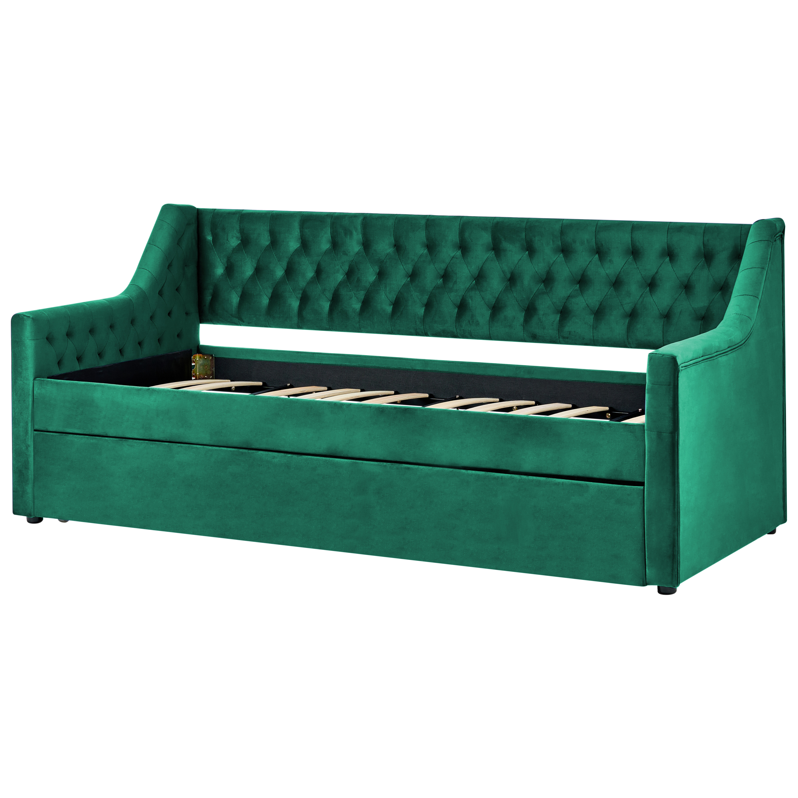 Lit avec tiroir glamour. Que ce soit dans un cadre rétro, glamour ou traditionnel, ce lit gigogne constitue un ajout splendide à toute chambre. Son cadre solide et durable est garni de velours doux au toucher, ce qui lui confère un aspect haut de gamme et élégant. Les accoudoirs bas et le dossier touffeté soulignent le design classique de la pièce. Équipé de deux sommiers à lattes, le lit est la garantie d'un sommeil sain et non perturbé.