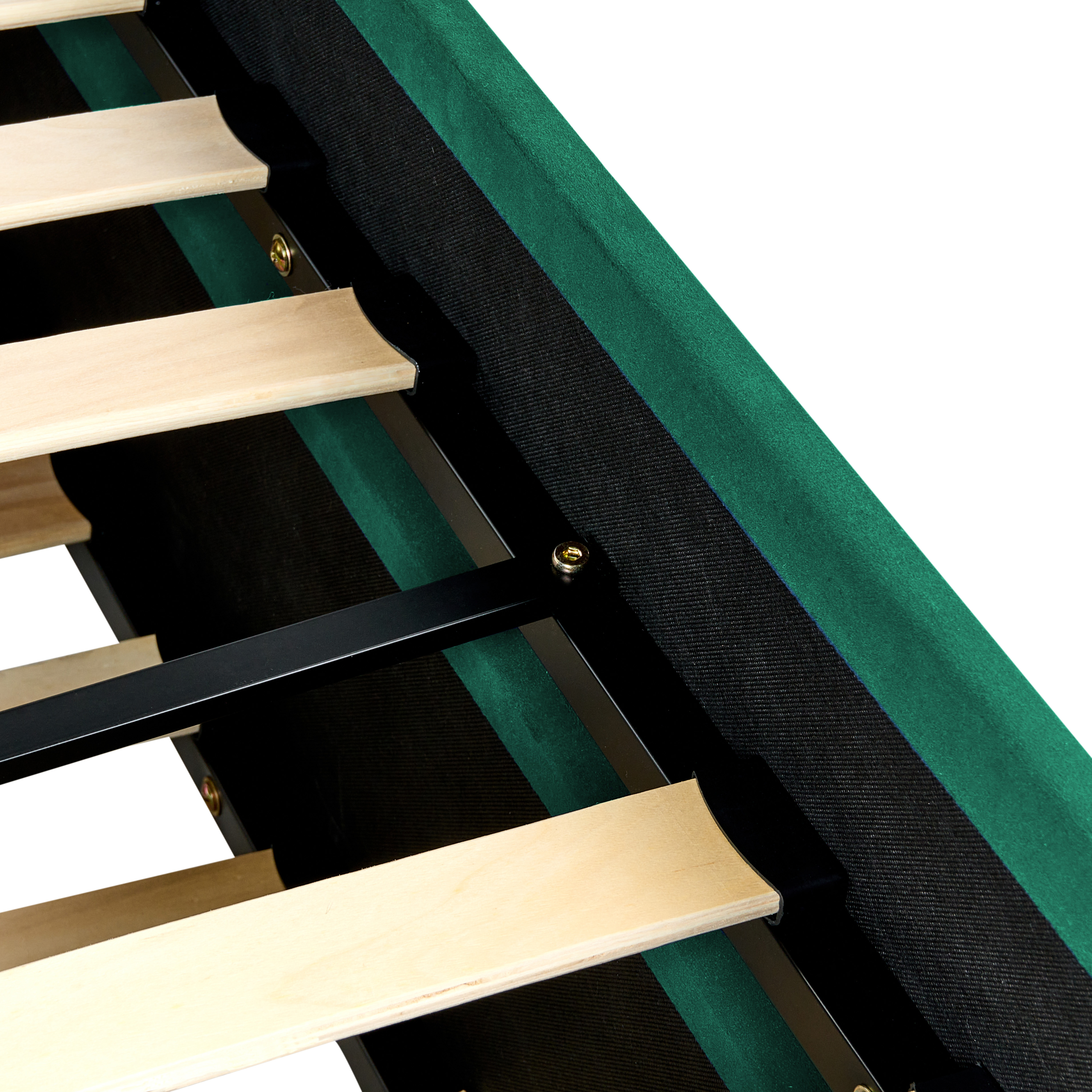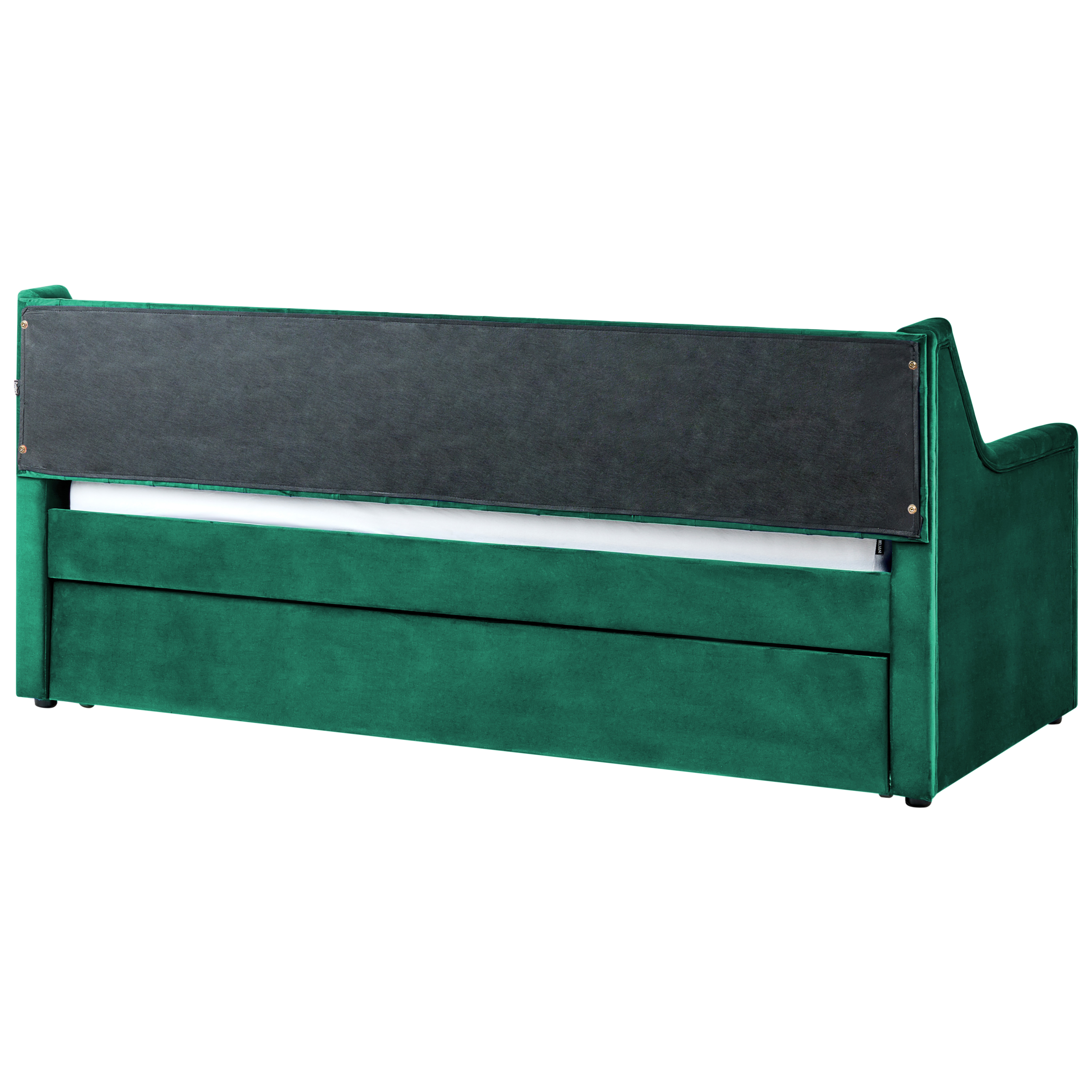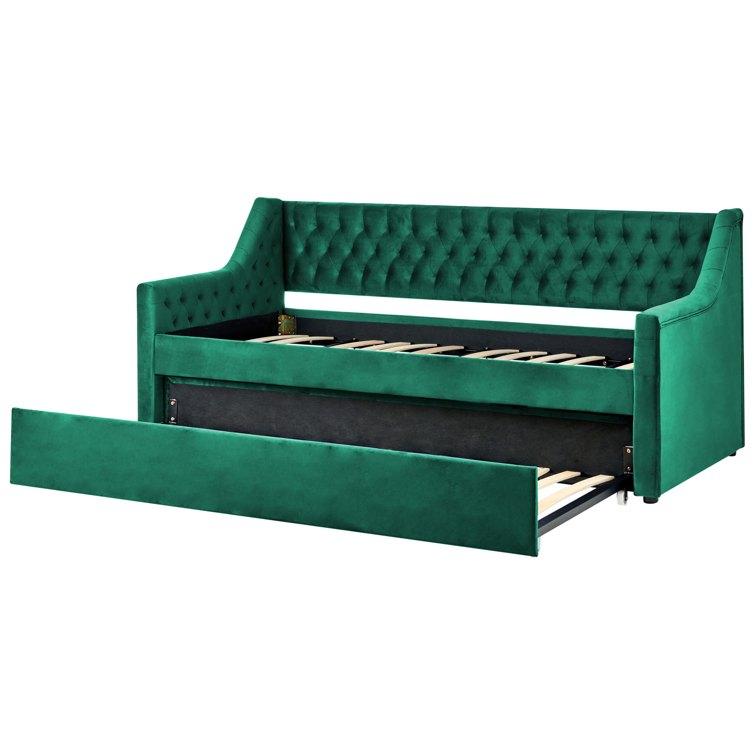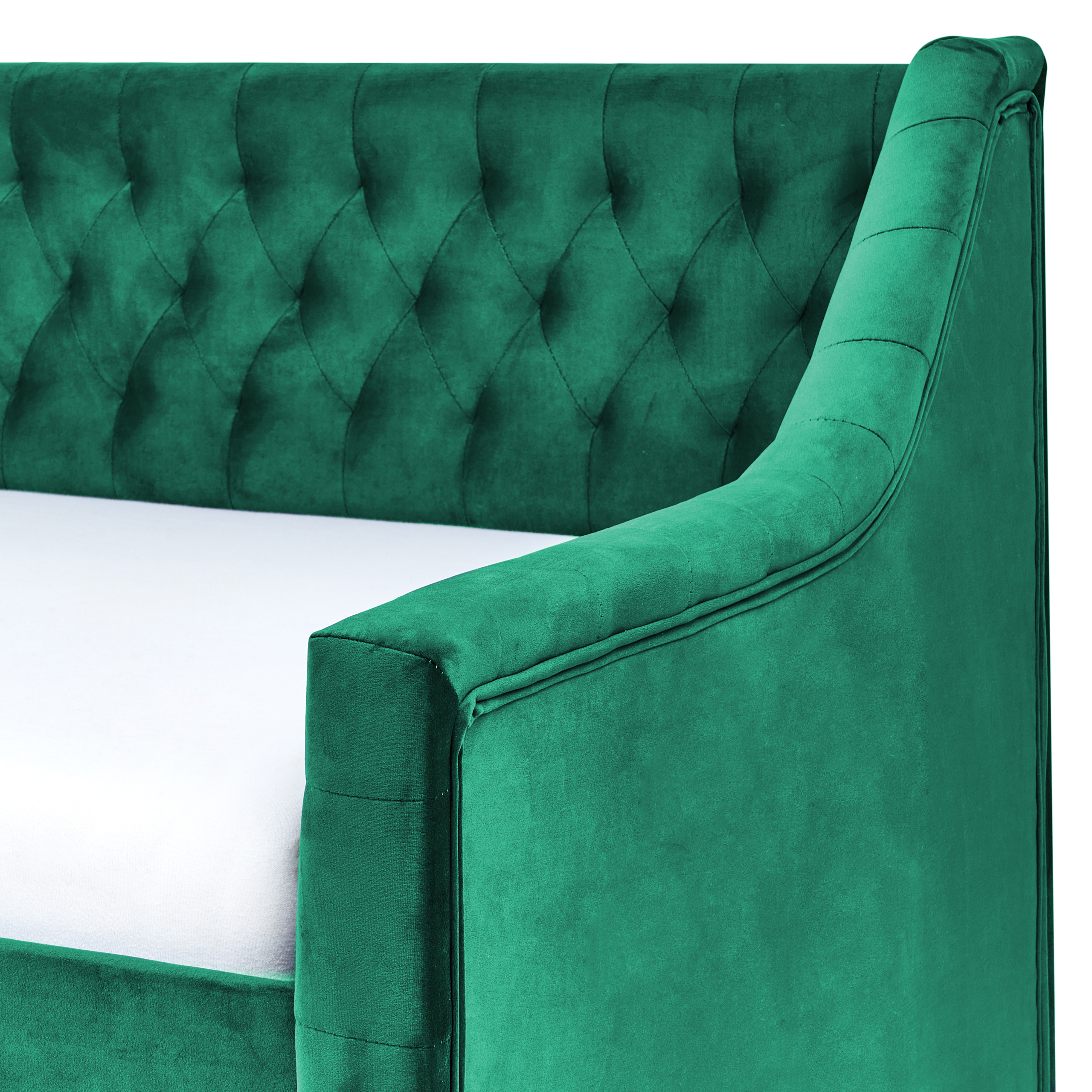 Lit avec tiroir glamour. Que ce soit dans un cadre rétro, glamour ou traditionnel, ce lit gigogne constitue un ajout splendide à toute chambre. Son cadre solide et durable est garni de velours doux au toucher, ce qui lui confère un aspect haut de gamme et élégant. Les accoudoirs bas et le dossier touffeté soulignent le design classique de la pièce. Équipé de deux sommiers à lattes, le lit est la garantie d'un sommeil sain et non perturbé.