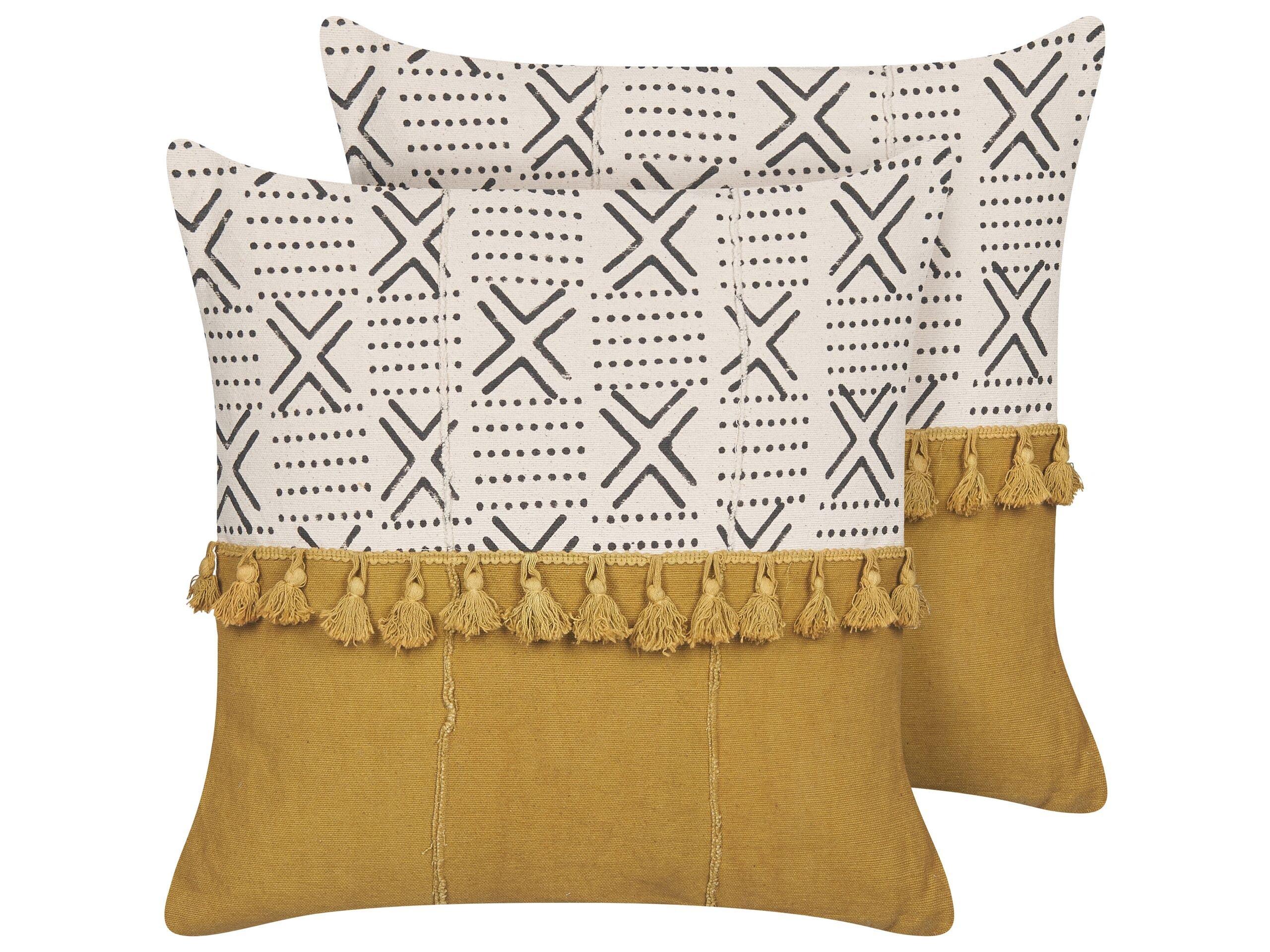 Coussins décoratifs. Cet ensemble de coussins de décoration moelleux est un accent complémentaire idéal pour votre canapé ou la tête de lit. Le mélange de tissu jaune moutarde avec des glands faits main et un motif géométrique en font des accessoires qui attirent le regard. Ce qui le rend spécial, c'est le motif qui a été réalisé à l'aide de la technique de l'impression en bloc. Si vous êtes à la recherche d'un coussin unique et magnifique, celui-ci sera parfait.