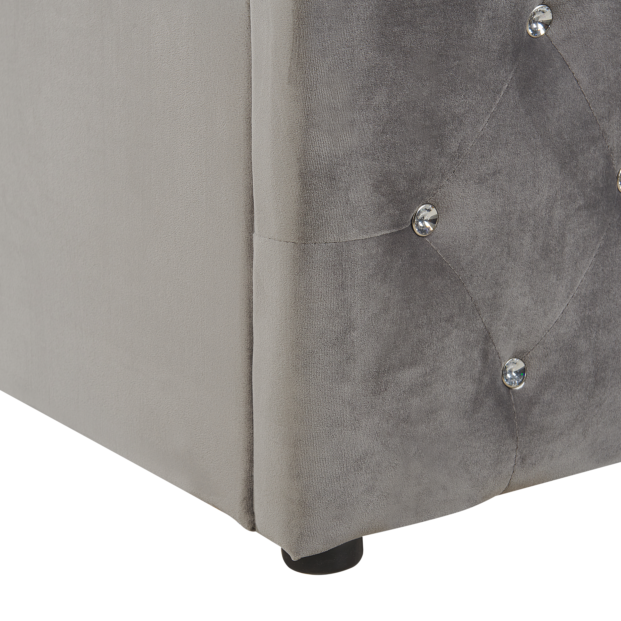 Lit avec rangement sous le sommier. Un lit parfait est essentiel pour une bonne nuit de repos. Celui-ci offre non seulement le confort, mais aussi un look élégant et haut de gamme. Son cadre métallique est recouvert d'une housse en tissu velours doux et soyeux de couleur neutre. La pièce comprend une tête et un pied de lit, décorés d'une touffe subtile et de faux cristaux rayonnants pour une touche glamour. Le lit est livré avec un ottoman de rangement qui pourra facilement accueillir tous vos draps et accessoires de chambre.