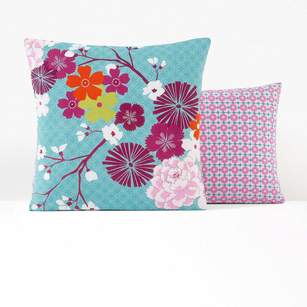 La taie d'oreiller Miss China en pur coton est disponible en forme carrée ou rectangulaire. Une face est imprimée d'un motif floral, l'autre face de petits motifs. La taie de traversin est imprimée de petits motifs. Des motifs d'Extrême-Orient rencontrent des couleurs vives, créant une ambiance atmosphérique dans la chambre à coucher.