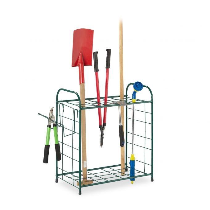 - Organisez vos outils de jardin grâce à un rangement à deux niveaux pour pelles, râteaux et balais.