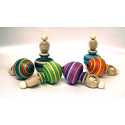 Toupie à fil difficile avec une grande masse, en plusieurs parties : corps en érable, anneau en hêtre stable, avec pointe en métal, 6 variantes de couleurs différentes dans un décor à rayures, avec description, emballée, Ø 55-60mm.