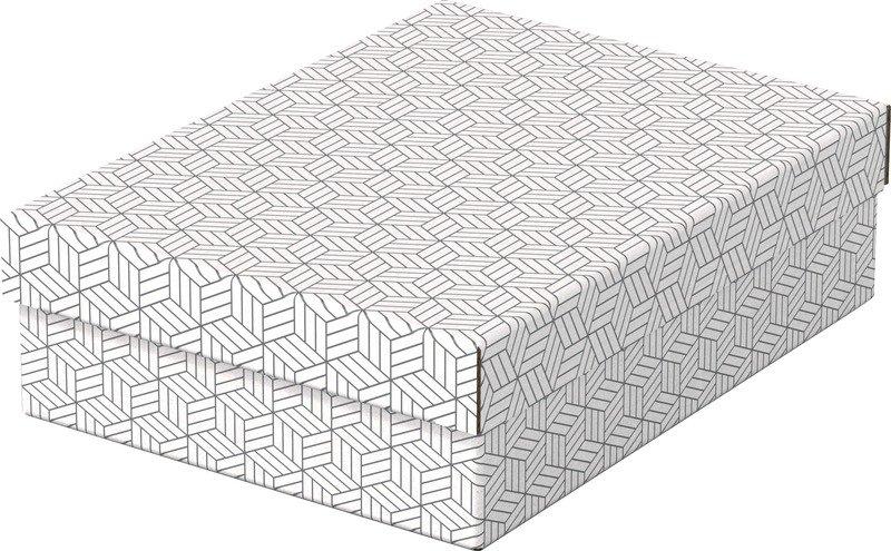 HOME - Aufbewahrungsboxen Elegante und moderne Aufbewahrungsboxen aus Wellpappe mit abnehmbarem Deckel, ideal zum Verpacken von Geschenken oder zum schnellen Verstauen von Utensilien zu Hause. Set mit drei Boxen der gleichen Größe, zur Aufbewahrung in Regalen oder in kubischen, offenen Möbeln, um kleinere Gegenstände wie Fotos und persönliche Dokumente ordentlich und leicht auffindbar aufzubewahren. Mit etwas Geschenkband können Sie mit diesen Boxen auch ein Geschenk verpacken! Nach dem Öffnen kann die Box dann vom Empfänger für die Aufbewahrung zu Hause wiederverwendet werden und bietet somit 2 Geschenke in einem. Hergestellt aus stabiler, 100 % recycelter und 100 % recycelbarer FSC-zertifizierter Wellpappe. Die abwischbare Oberfläche ist mit einem zweifarbigen, geometrischen Design versehen, um Ihrer Aufbewahrung Stil zu verleihen. Wird flach verpackt geliefert und lässt sich schnell und einfach aufbauen. Die robuste Konstruktion mit doppelten Seitenwänden und Boden sorgt für Stabilität und Langlebigkeit. Set bestehend aus drei kleinen dekorativen Aufbewahrungsboxen aus Pappe mit einem eleganten, modernen und zweifarbigen geometrischen Design. Die dezenten Farben passen zu jeder Inneneinrichtung, ideal als Geschenkbox oder zur Aufbewahrung von Unterlagen, Fotos und anderen Utensilien Jede Aufbewahrungsbox verfügt über einen abnehmbaren Deckel, um den Inhalt der Box zu verdecken und zu schützen. Sie kann auch als nachhaltige Geschenkverpackung verwendet und vom Empfänger zur Aufbewahrung zu Hause genutzt werden Wird flach verpackt geliefert und ist schnell und einfach aufzubauen. Die doppelten Seitenwände sorgen zusätzlich für Stabilität. Können eigenständig genutzt werden oder dienen als Stauraum in Regalen Hergestellt aus 100 % recycelter und 100 % recycelbarer, FSC®-zertifizierter Wellpappe mit beschichteter, abwischbarer Oberfläche und plastikfreier Verpackung Lieferumfang: 3 x Esselte Home Aufbewahrungsboxen mit Deckel, Klein, Abmessungen (B x H x T): 200 x 150 x 255 mm, Gewicht: 336 g, Geometrisches Design, Weiß, 628280 Plastikfreie Verpackung aus 100 % recyceltem und 100 % recycelbarem Material