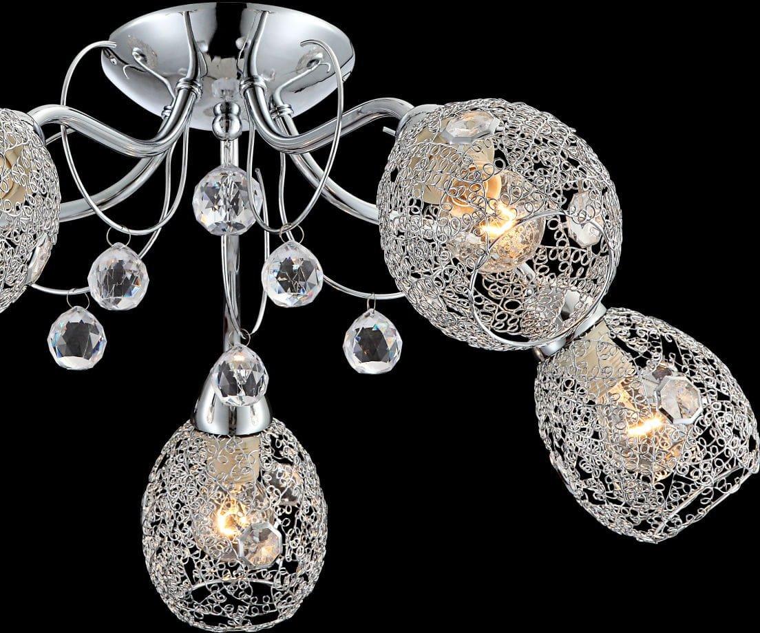 Avec son design élégant, ce plafonnier rond de la série Kordula, avec un diamètre de 54 cm, attire tous les regards dans toutes les pièces. Un beau chrome forme la base. Les cinq bras incurvés ont des points, qui sont fournis avec une maille chromée. Des cristaux de verre et des suspensions de cristaux acryliques donnent à cette lampe un aspect unique. Les cinq ampoules pour les douilles E14 peuvent être choisies librement jusqu'à une puissance maximale de 40 watts. En raison de leur économie d'énergie et de leur longévité, nous recommandons les lampes à LED.