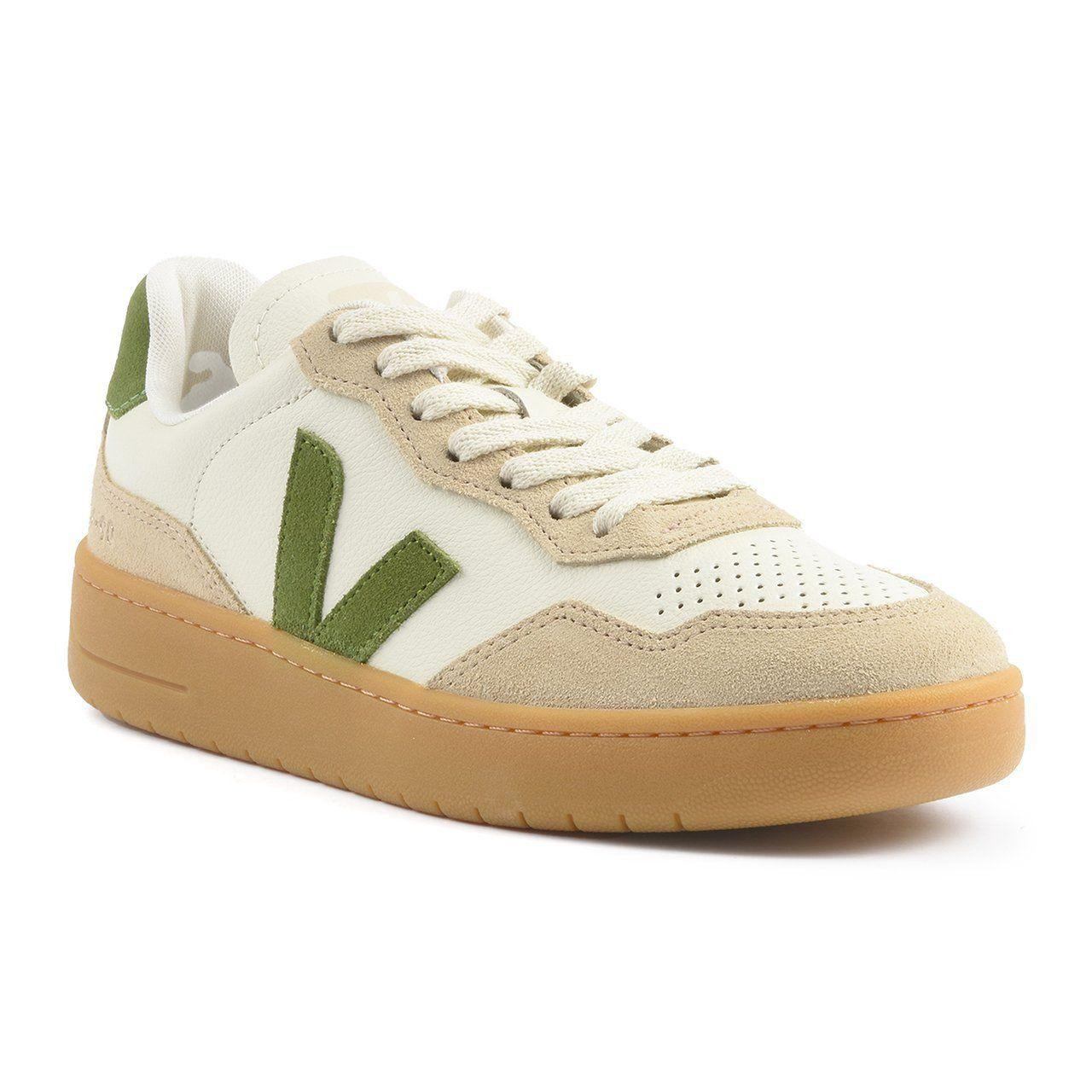 La couleur écru des Sneakers Basses Veja V-90 est complétée par des accents verts, ajoutant une touche de nature et de style. La semelle extérieure en caoutchouc est de couleur tan avec des coutures visibles le long du pourtour. Un grand logo « V » en vert olive orne le panneau latéral, ajoutant une touche de personnalité à ces chaussures.