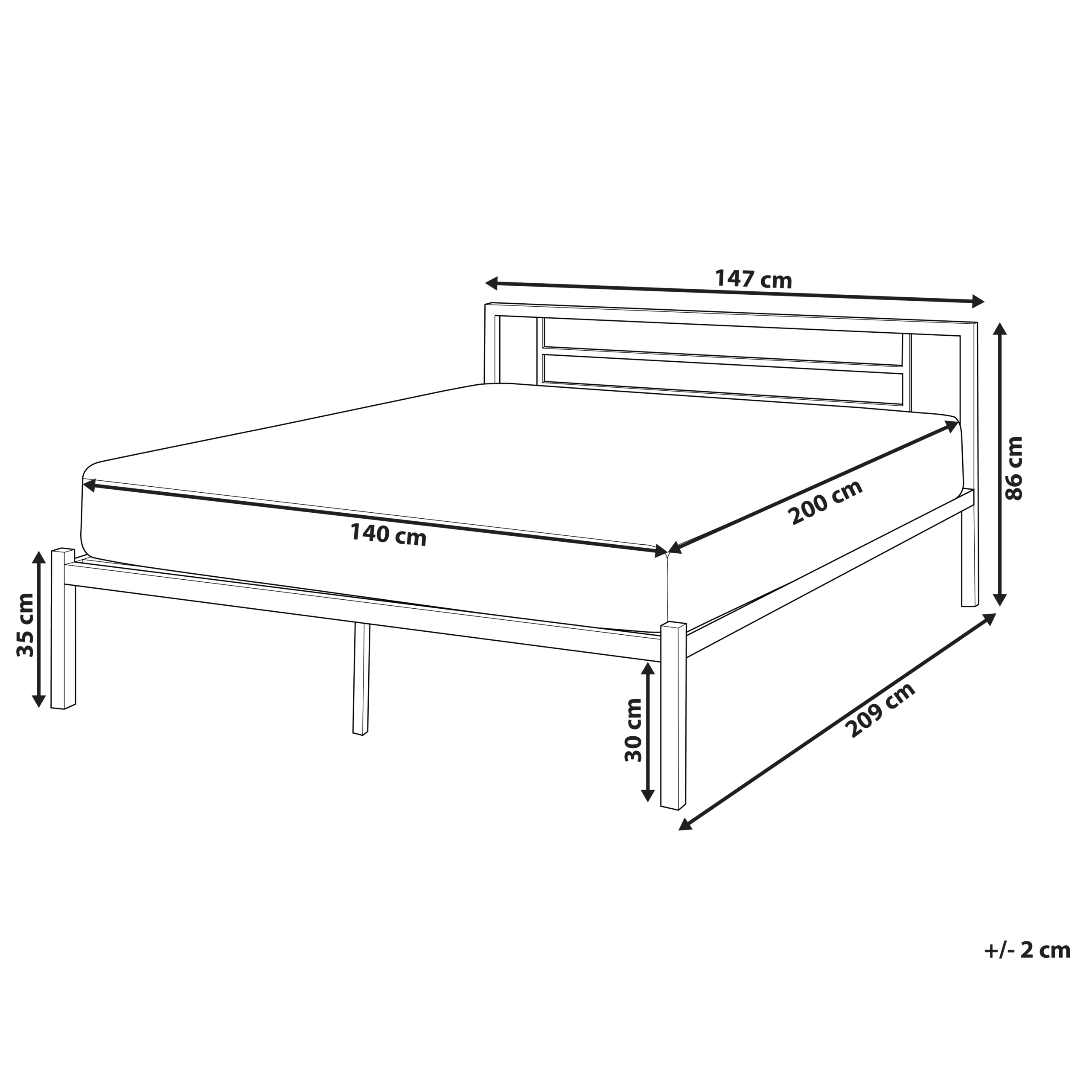 Dimensions de lappuie-tête:</b> 147x56<br> <b>Largeur:</b> 147 cm<br> <b>Longueur:</b> 209 cm<br> <b>Hauteur:</b> 86 cm<br> <b>Surface de couchage:</b> 140x200 cm<br> <b>Poids:</b> 21 kg<br> <b>Charge admise:</b> 200 kg<br> <br><b>Loffre inclue: 1 x Cadre de lit, 1 x Sommier (24 lattes articulées), Non inclus : matelas et parure de lit