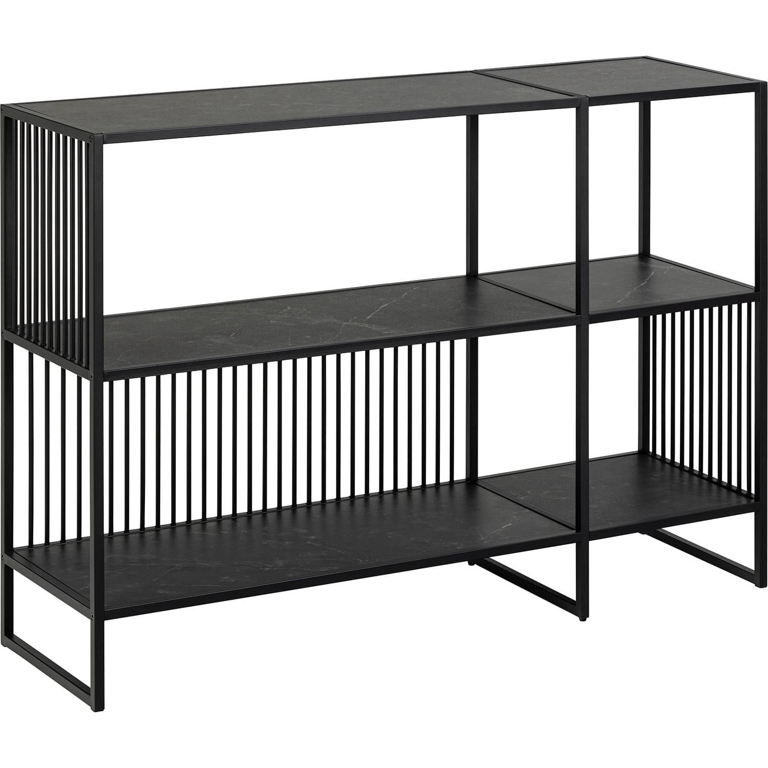L'étagère Iola est une bibliothèque moderne qui séduit non seulement par sa fonctionnalité, mais aussi par son design. L'étagère offre un grand espace de rangement et est équipée de deux étagères décorées d'une élégante finition en marbre noir. Le cadre robuste en acier noir est revêtu par poudre rugueuse et assure la stabilité nécessaire. Des fils ronds verticaux confèrent à l'étagère un intérêt visuel et soulignent son look moderne. Le corps est fabriqué en mélamine noire mate Izmir rugueuse et le cadre en acier noir mat revêtu par poudre rugueuse, ce qui confère à l'étagère une note élégante.