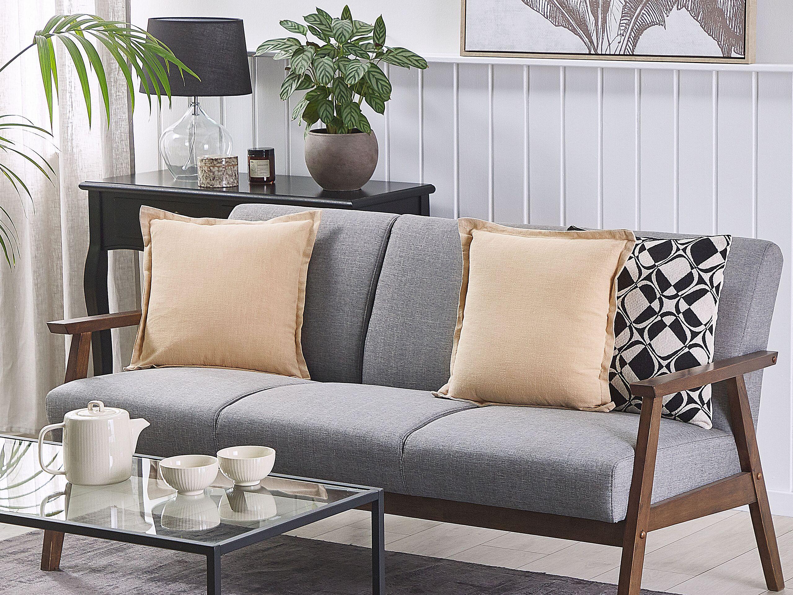 Coussins décoratifs tendance couleur beige. Sublimez votre salon sans aucun effort avec cet ensemble de coussins décoratifs ! La couleur sobre de l'ensemble s'adapte à tous les types d'intérieurs. Les housses sont un mélange de polyester, de coton et de lin et peuvent être facilement retirées pour le nettoyage.