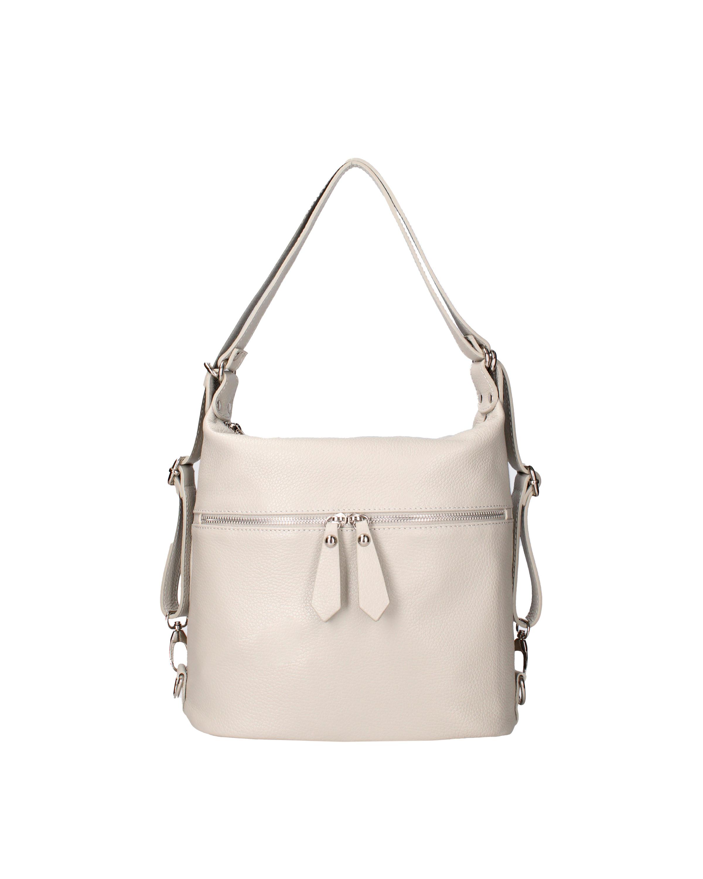 Sac à bandoulière convertible dans le sac à dos féminin. La fermeture est avec Zip. Les poches internes sont une avec zip et deux ouvertes. Les poches externes sont un avant zip et un arrière zip. Le bandoulière est réglable en cuir. La poignée est réglable en cuir. Les compartiments internes en sont un. Le matériau externe est une vraie peau d'un dollar. Il est doublé en interne dans un tissu de coton à 70% - 30% de polyester. Mesures: 30x26x9 cm. Fabriqué en Italie