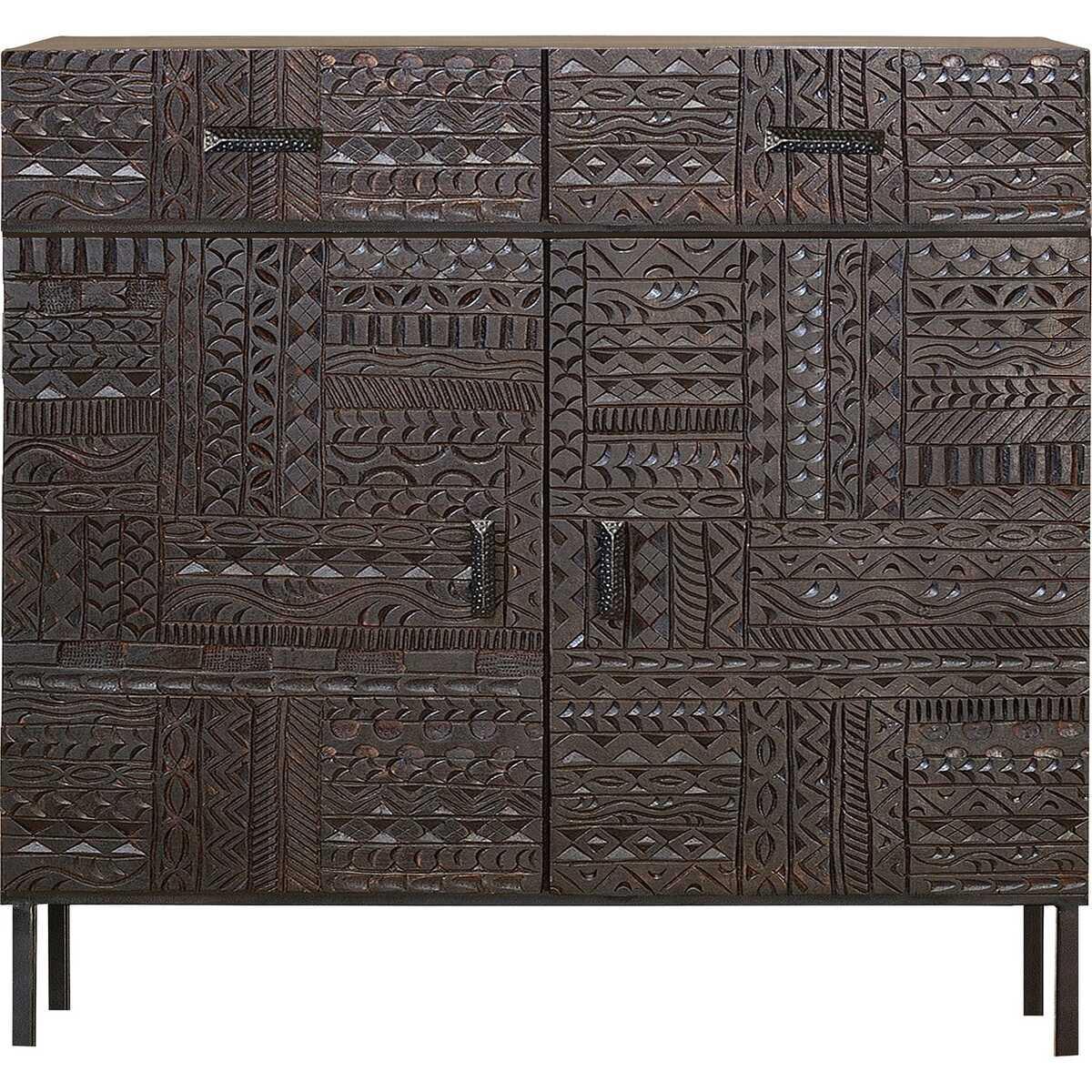 Buffet en bois de manguier avec 2 tiroirs, 2 portes et étagère intérieure. Pied en métal. Dimensions portes : 46 x 50. Façades tiroirs : 15 x 50. Dimensions tiroirs intérieurs : 9 x 43 x 20.