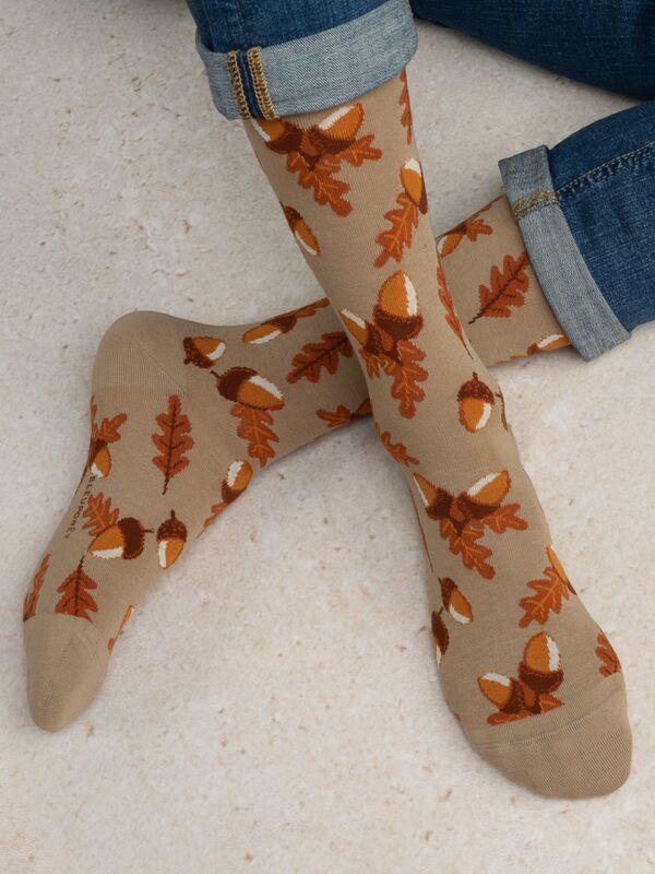 Ces chaussettes classiques présentent un charmant motif de glands et de feuilles de chêne, parfait pour ajouter une touche de style inspiré de la nature à n'importe quelle tenue. Le design est à la fois ludique et sophistiqué, faisant de ces chaussettes un accessoire polyvalent. Fabriquées à partir d'un mélange de coton doux et résistant, elles offrent un ajustement confortable avec un excellent maintien sans serrer. Ces chaussettes de haute qualité sont fabriquées en France/Vosges.