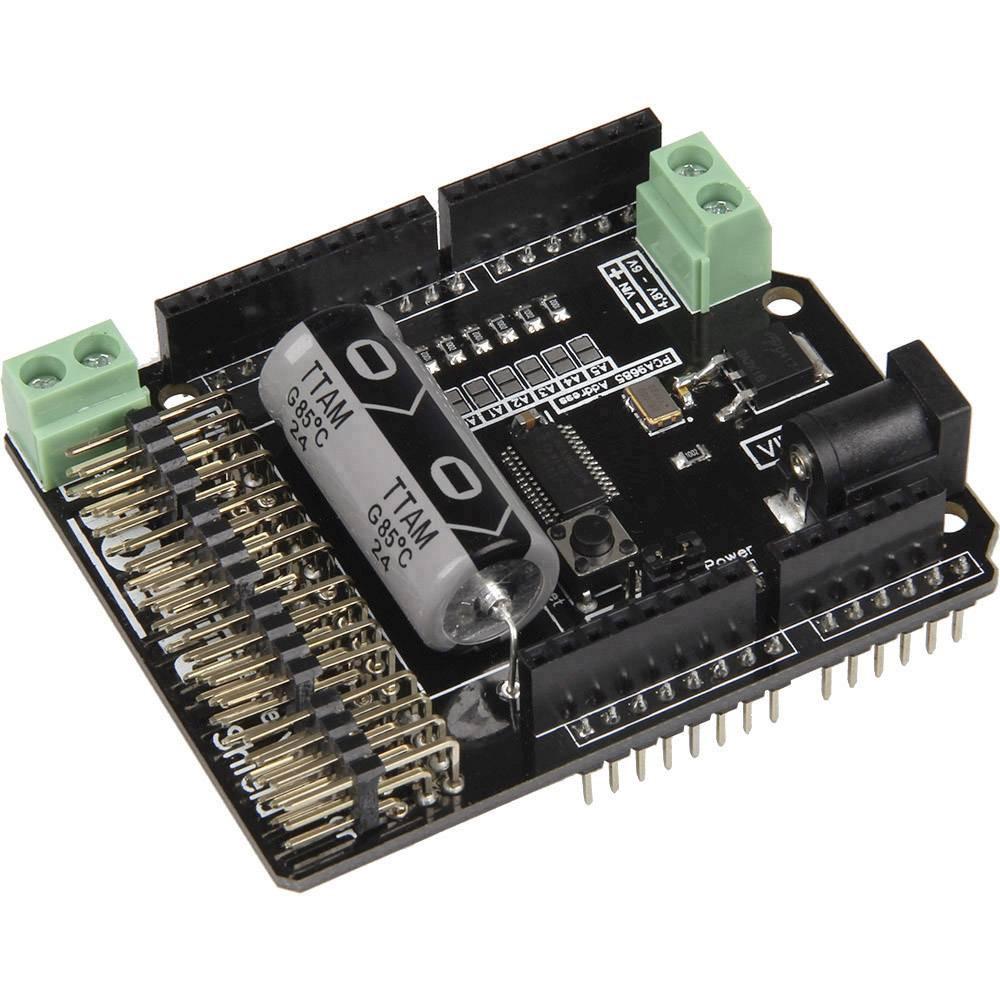La carte Motorino est une carte dextension qui permet de commander et dutiliser jusquà 16 moteurs pas-à-pas 5 V à commande PWM. Le générateur dhorloge propre sur le Motorino garantit un signal PWM et donc un positionnement exact. La carte dispose de 2 entrées pour une tension de 4,8 à 6 V permettant à elles deux une alimentation jusquà 11 A. Elle garantit ainsi une alimentation toujours optimale des moteurs et une intensité suffisante pour les projets de grande envergure. Lalimentation se fait de manière centralisée via le Motorino celui-ci dispose dun port séparé pour chaque moteur, pour la tension, la masse et le câble de commande. Grâce au condensateur intégré, le courant est amorti, ce qui réduit la chute de tension en cas de surcharge brève (pouvant provoquer des à-coups). Il est possible de raccorder un condensateur supplémentaire. La commande et la programmation des moteurs peuvent se faire de manière habituelle, via le Arduino. La notice fournie et les exemples de codes permettent aux débutants dobtenir rapidement des résultats.