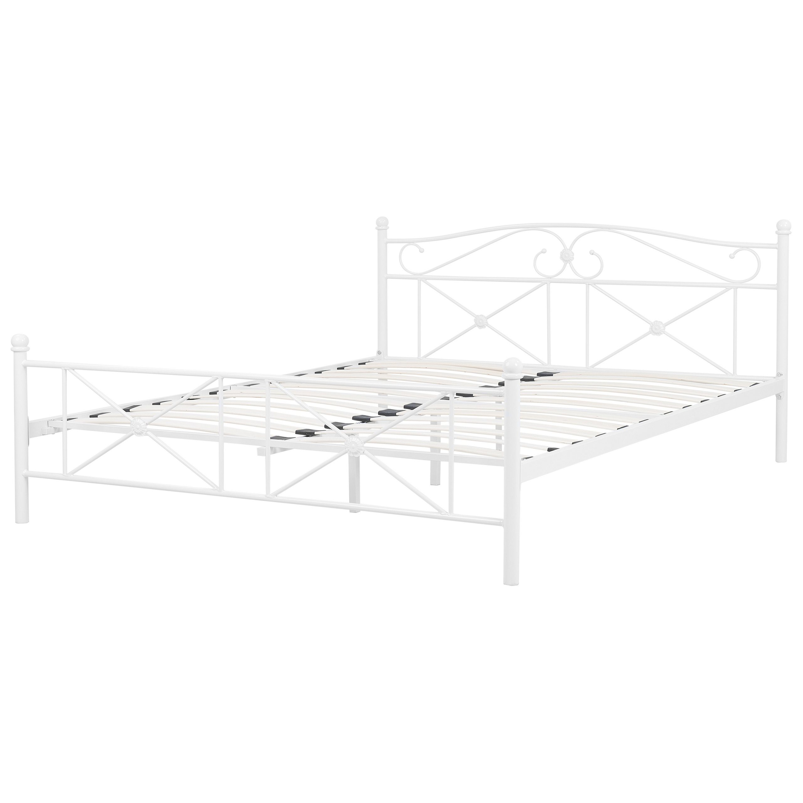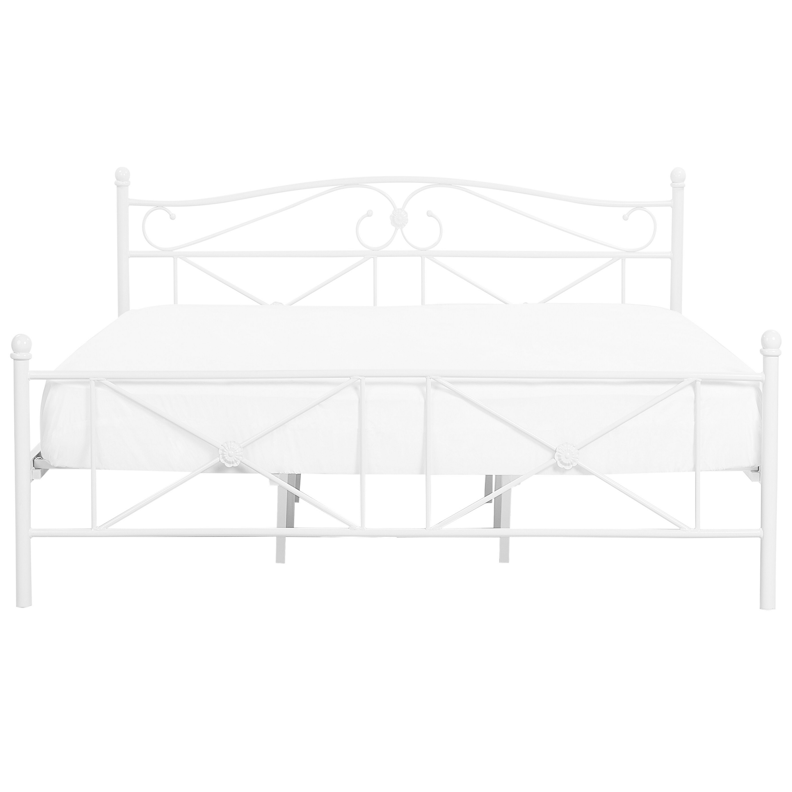 Lit deux places métallique. Ce lit double présente une finition blanche, une structure en métal et une tête de lit avec des ornements délicats. Ce cadre de lit est un choix parfait pour n'importe quelle chambre à coucher. Sa construction solide en métal et le sommier à lattes inclus offrent le soutien nécessaire et assurent le confort de couchage optimal.