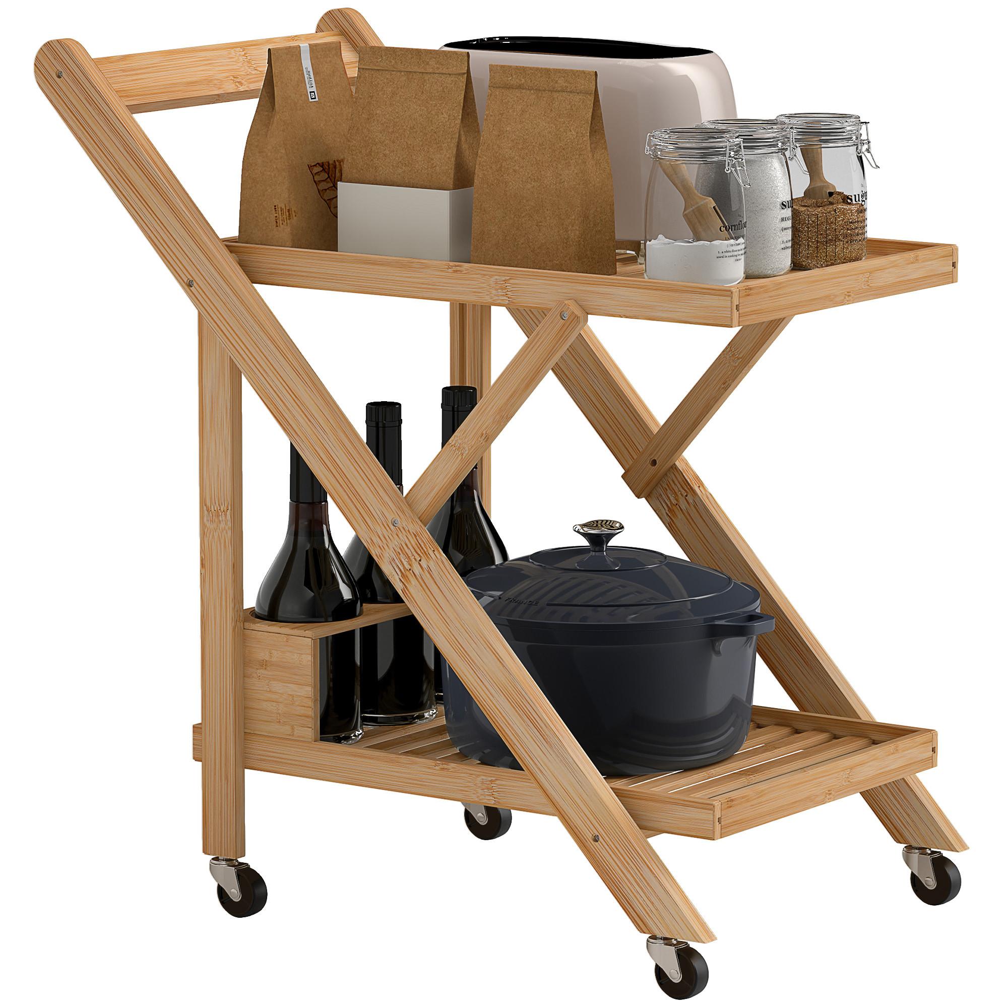 Animez vos soirées avec le chariot de cuisine élégant de HOMCOM en bambou! Il dispose de deux plateaux et peut accueillir trois bouteilles de vin. Pour un rangement pratique et peu encombrant, il se plie facilement. Grâce à ses quatre roulettes (dont deux avec frein), ce chariot se déplace aisément dans toutes les pièces. Profitez d’un confort élégant et fonctionnel!