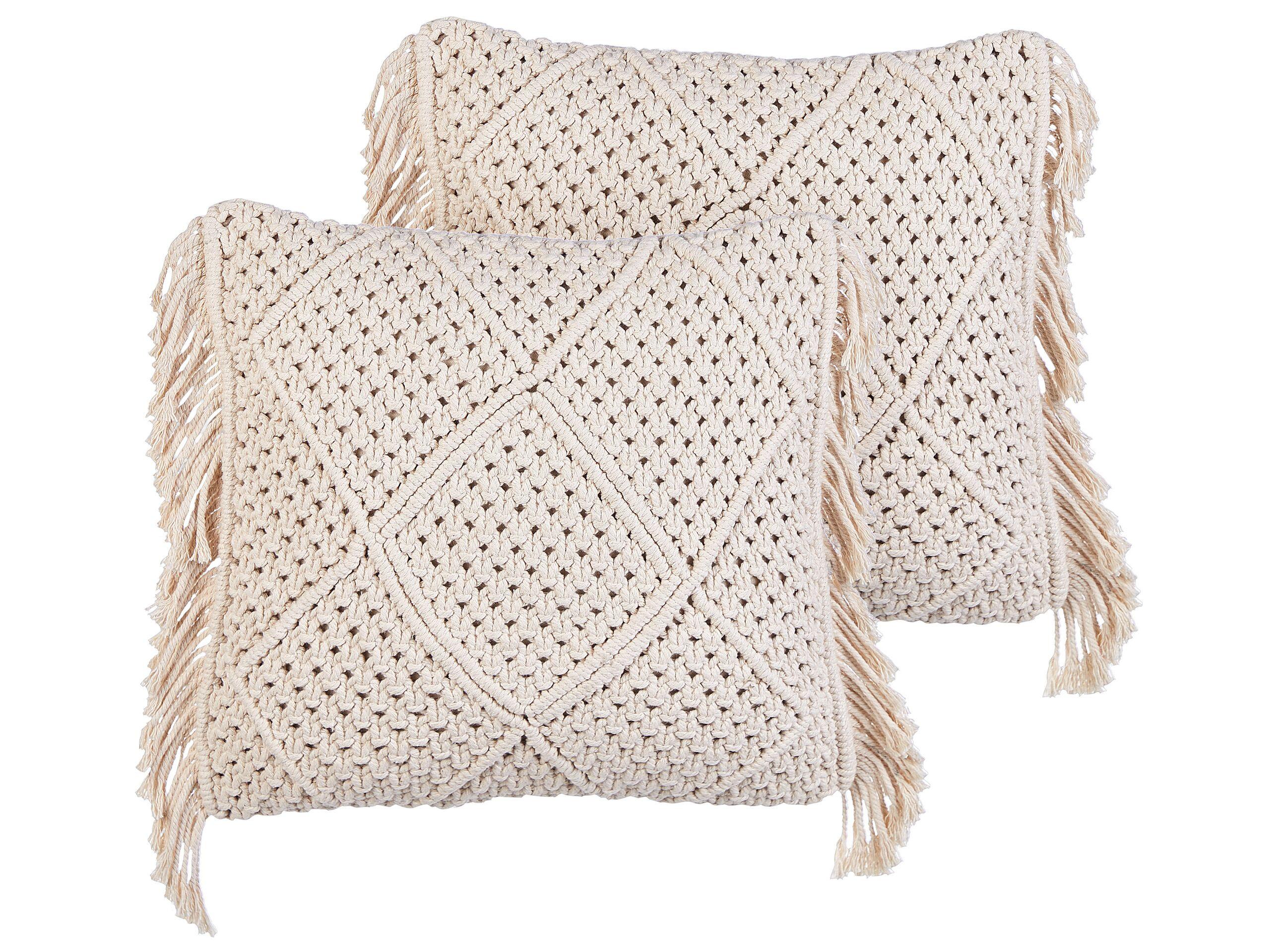 Coussins en crochet. Transformez votre espace avec ces deux coussins en coton artisanal dont les façades en macramé sont ornées de charmants pompons. Profitez de la commodité des housses amovibles avec des fermetures éclair cachées qui facilitent l'entretien. Profitez du confort supplémentaire des rembourrages doux inclus pour une maison chaleureuse et élégante.