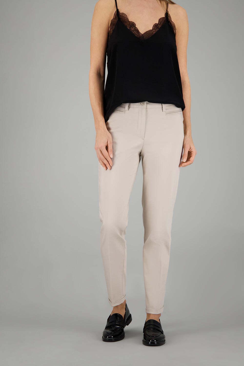 Le pantalon Denise en beige clair combine une coupe droite classique avec des détails modernes. La coupe légèrement raccourcie avec un ourlet retourné donne un look frais, tandis que le stretch moyen offre un confort de port. Ce pantalon est parfait pour les tenues chics ou décontractées.