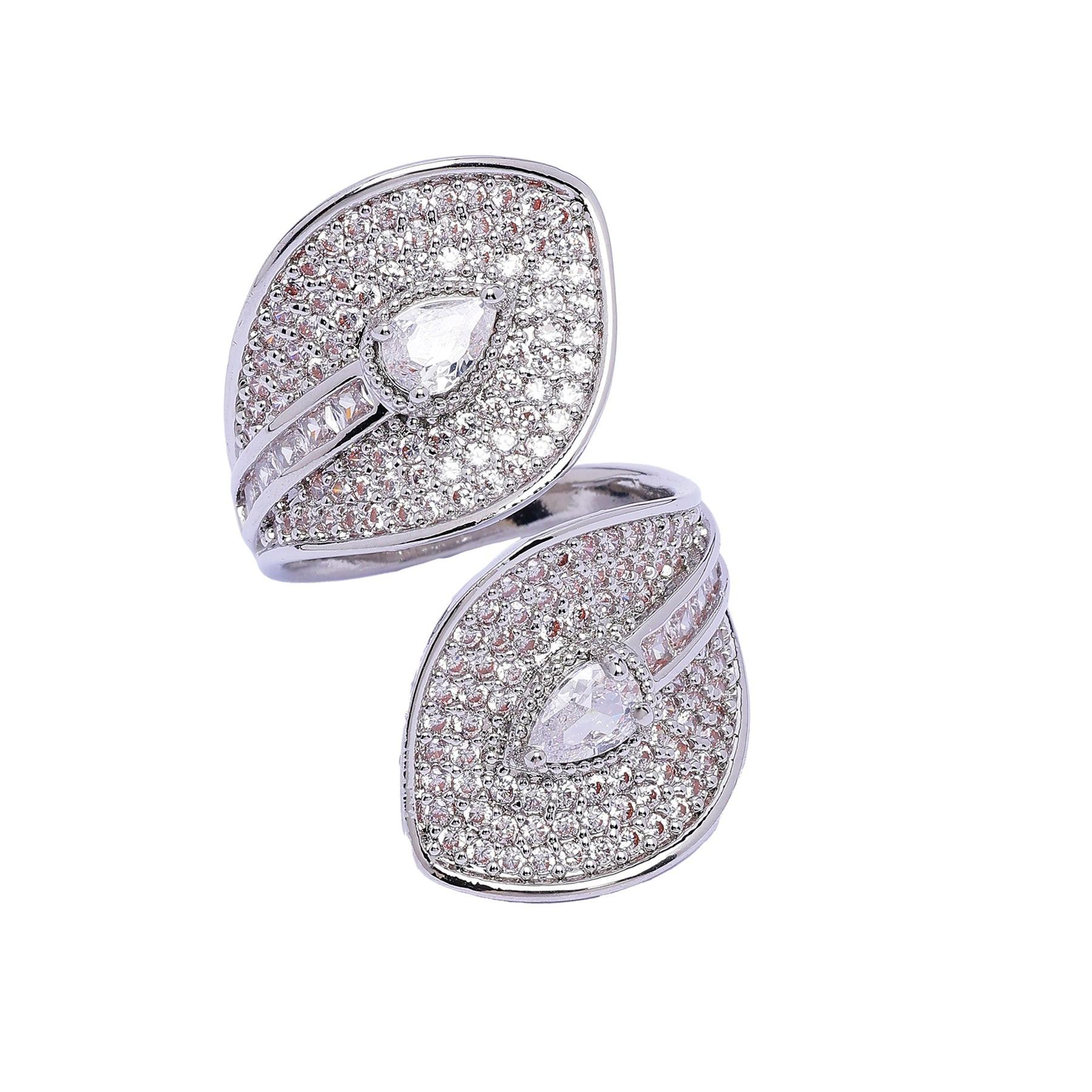 Ce modèle évoque une fleur délicate, ornée en son cœur d'une pierre étincelante en forme de poire. L'anneau est serti d'une multitude de petites pierres scintillantes, créant un bijou unique et envoûtant. Pièce maîtresse qui respire l'élégance et le raffinement, il est idéal pour apporter une touche de glamour à toutes vos tenues. Dimensions : 2,0 cm x 3,5 cm | Placage : Rhodium | Fermeture : À enfiler