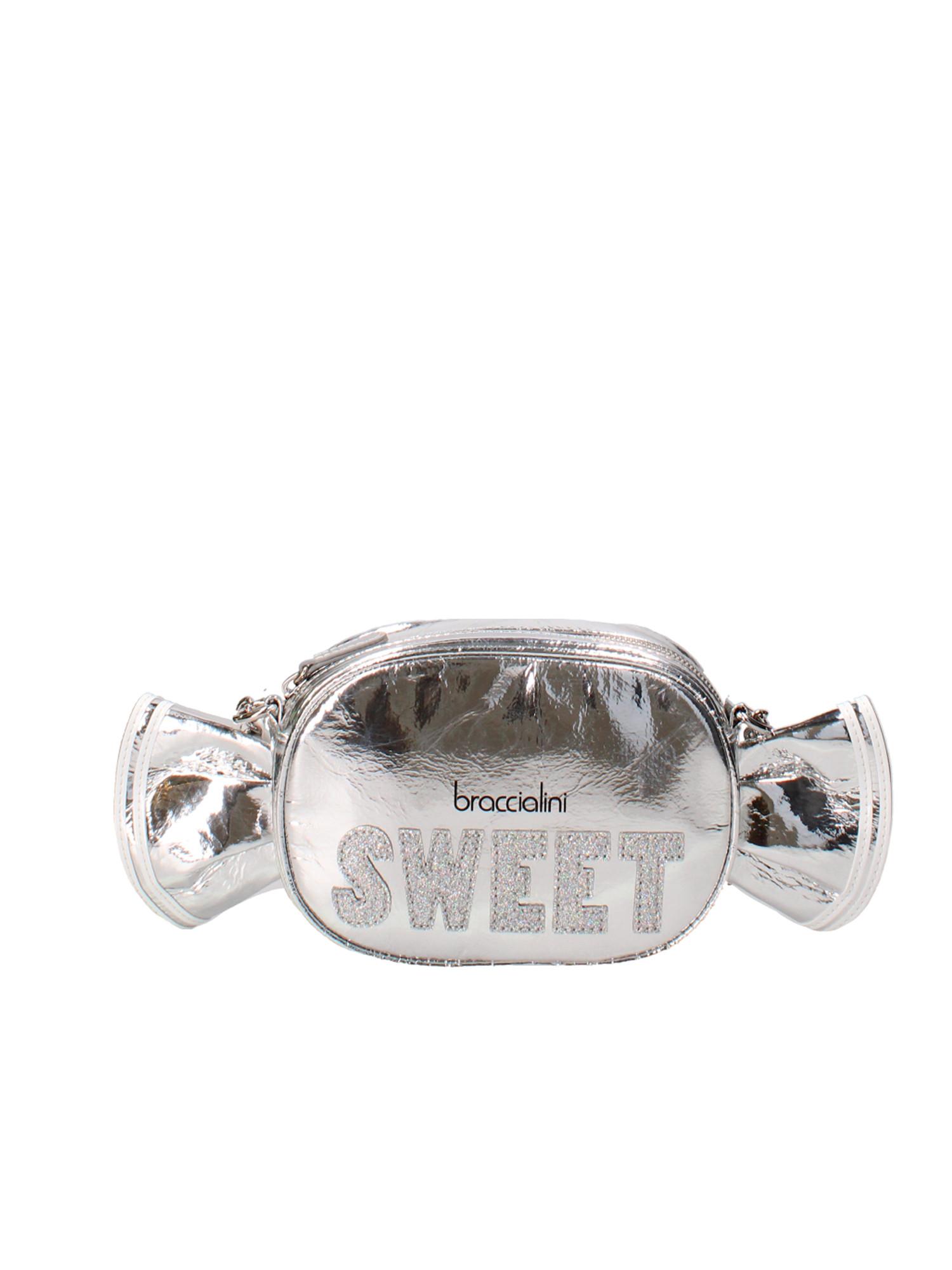 Sac en forme de bonbon avec fermeture à fermeture éclair et bandoulière fixe avec chaîne attachée.