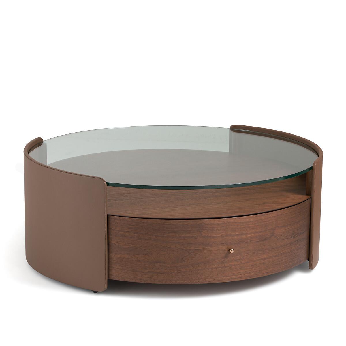 La table basse Firmo en noyer et cuir emprunte les codes des années 50 avec ses courbes qui adoucissent les volumes.