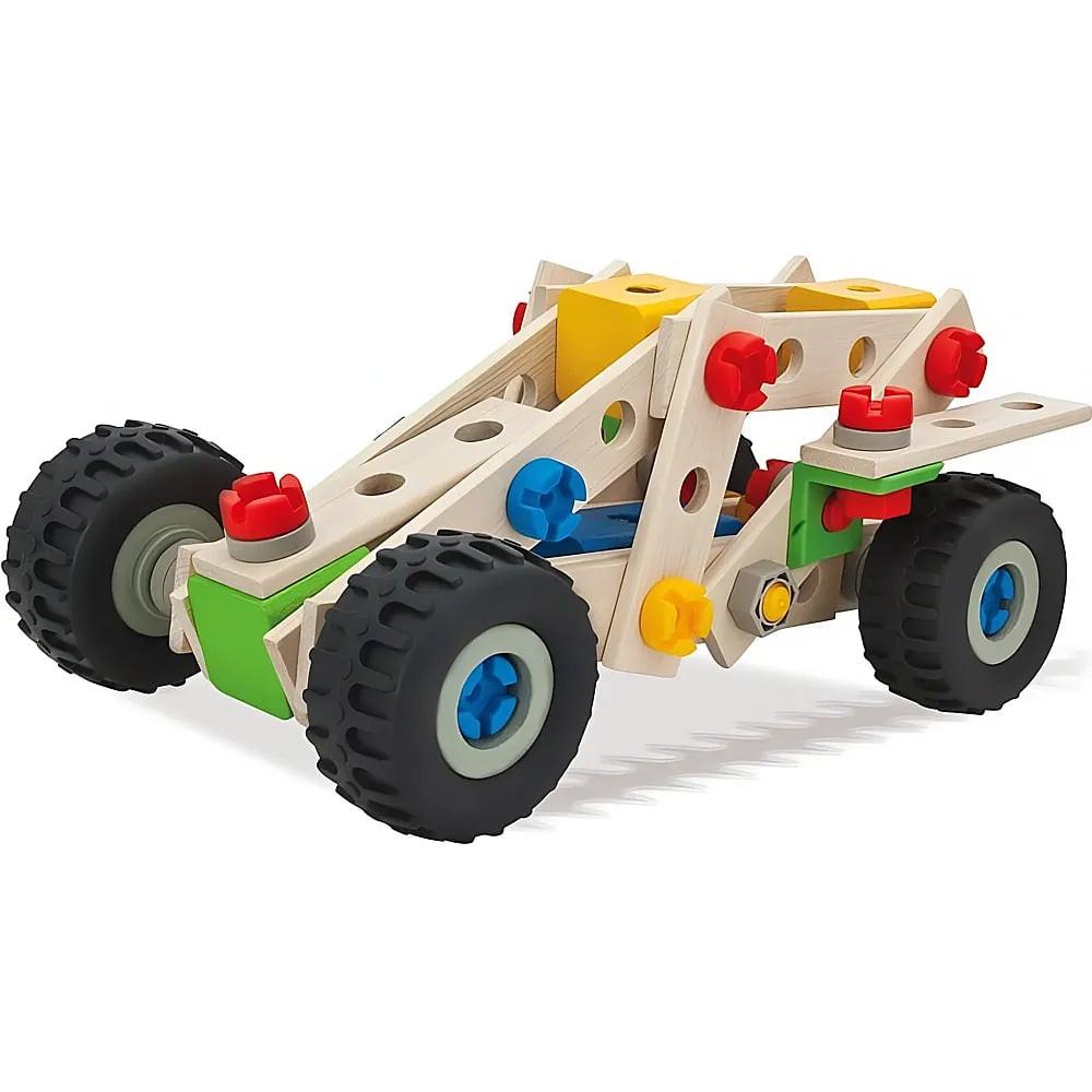 Mit diesem 100-teiligen Constructor Set bauen Sie ein Quad, ein Trike, einen Minibuggy oder ein Motorrad. Das Set enthält alle notwendigen Holzteile, Schrauben und Werkzeuge, um die Modelle zusammenzuschrauben. Ideal zur Förderung von räumlichem Denken und Feinmotorik.