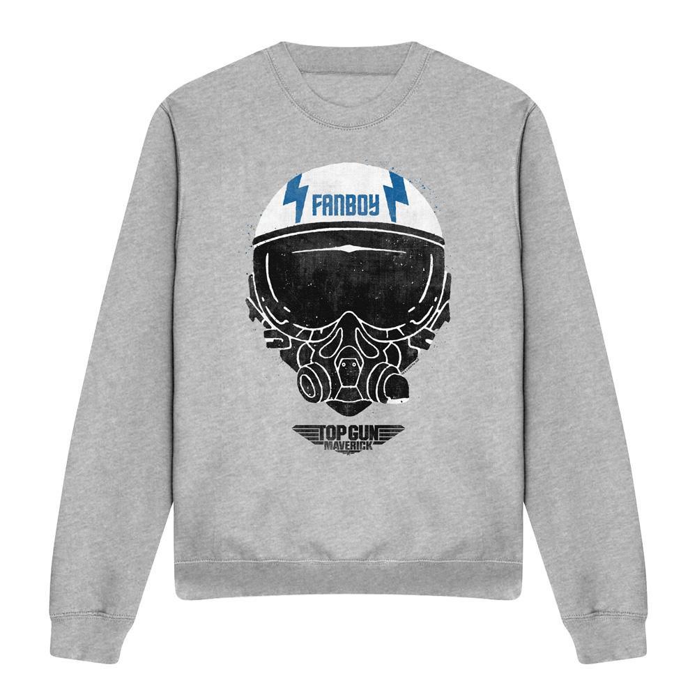 Ce sweatshirt présente un imprimé graphique distinctif sur le devant, mettant en valeur un casque de pilote avec le texte « FANBOY » et des détails d'éclairs, ainsi que le logo « TOP GUN MAVERICK ». Le design est réalisé dans un style vieilli, ajoutant une esthétique vintage au vêtement. Le sweatshirt a un col rond classique et des manches longues, ce qui en fait un ajout confortable et polyvalent à une garde-robe décontractée.