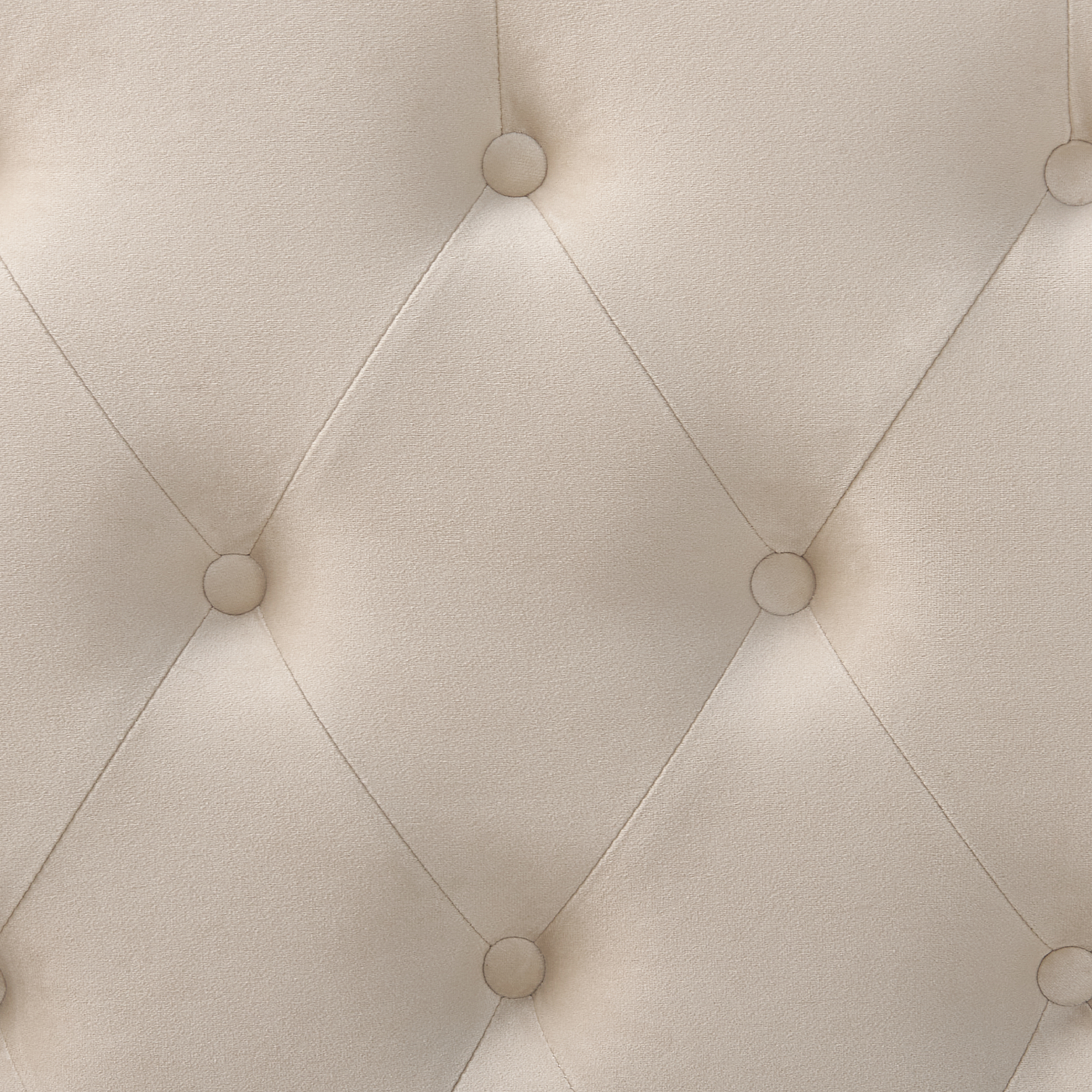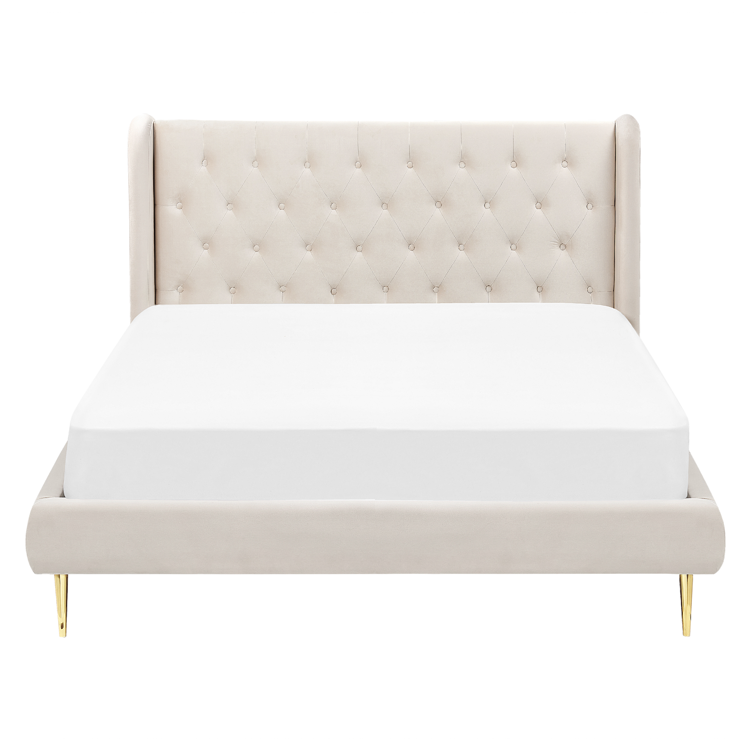Lit deux places à tête de lit capitonnée. Introduisez un décor glamour dans votre chambre à coucher avec ce lit élégant. Tapissé en velours de haute qualité, la pièce est agréable au toucher et semble élégante, tout en étant très durable. La tapisserie beige, associée à des pieds en métal doré, lui confère un aspect remarquable, tandis que son design glam est renforcé par une tête de lit capitonnée. Le lit est également livré avec un jeu de lattes, qui vous aidera à maintenir une bonne position pendant la nuit et vous permettra de vous détendre.