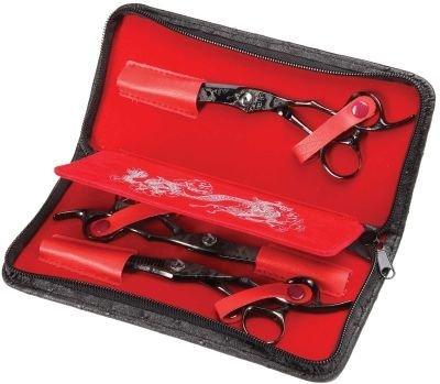 Le jeu de 3 comprend : ciseaux à cheveux 5.5'', ciseaux à cheveux 6.25'', ciseaux de modelage style japonais avec 28 dents, huile pour ciseaux, anneaux pour les doigts, chiffon en microfibre, sac à fermeture éclair.