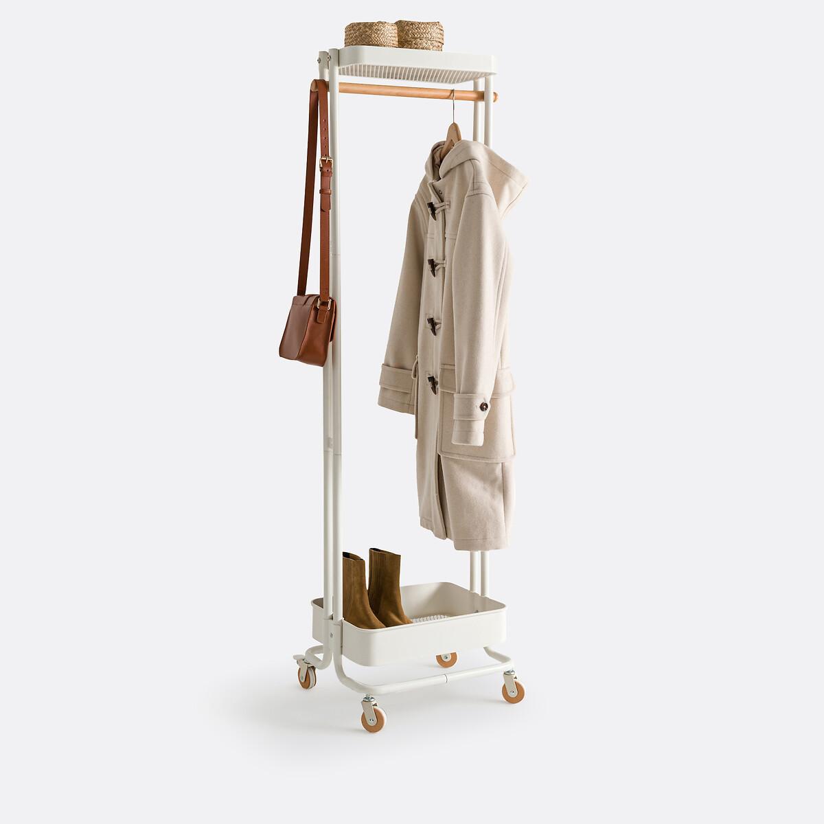 Le portant à roulettes en fer et hévéa Tania se révèle vraiment indispensable pour ranger tous ses vêtements.