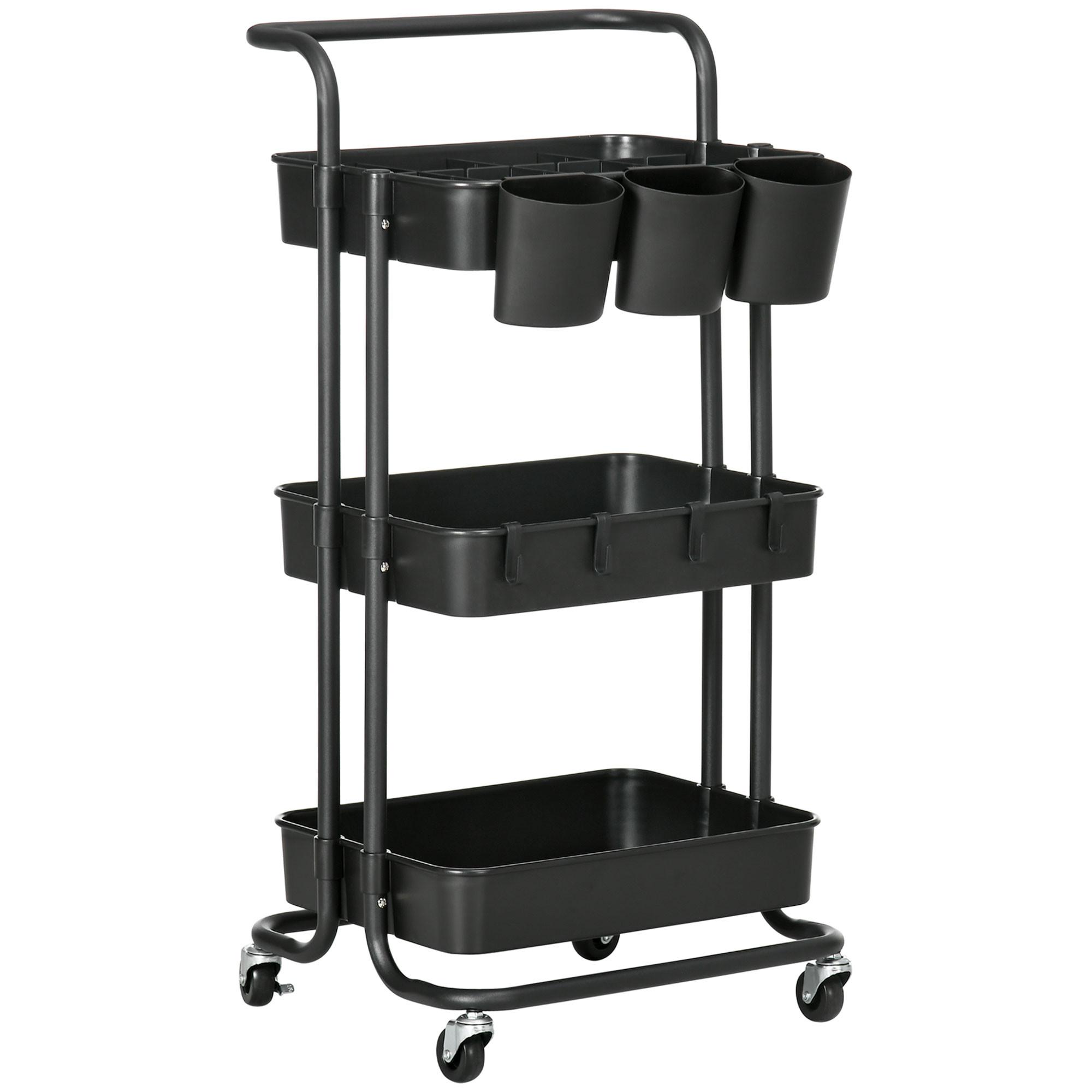 Ce chariot est compact et idéal pour les petits espaces nécessitant un espace de stockage supplémentaire. Les trois paniers de rangement, les trois boîtes suspendues amovibles et les quatre crochets amovibles offrent suffisamment d'espace pour diverses choses. Les roues souples vous permettent de déplacer le chariot là où vous en avez le plus besoin. Il convient parfaitement comme chariot de service pour les ustensiles d'art, comme chariot de cuisine avec espace de rangement, comme table d'appoint dans le salon et comme étagère roulante pour l'atelier.