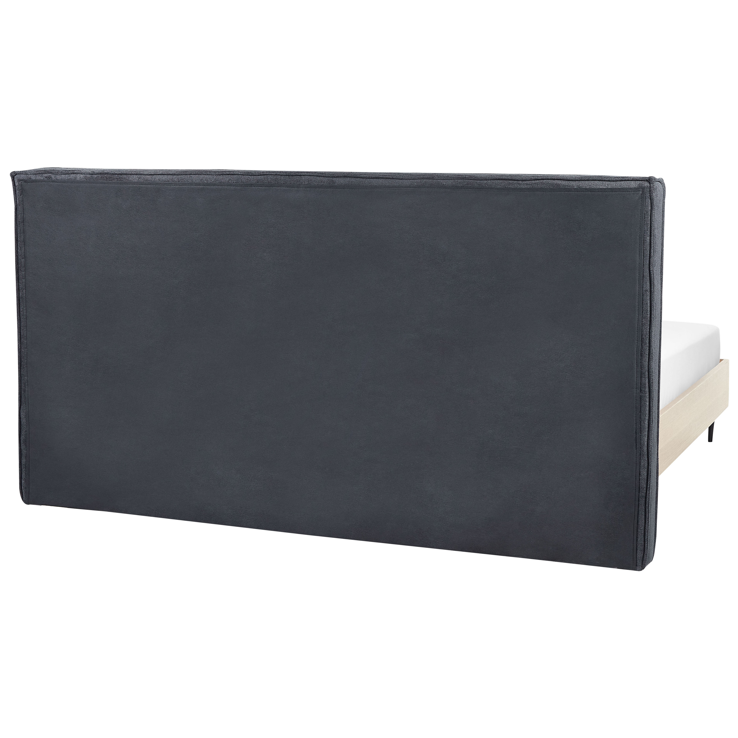 Cadre de lit moderne avec tête de lit rembourrée. Aménagez votre chambre à coucher avec ce lit élégant pour créer un environnement de sommeil confortable. Son design moderne est accentué par la tête de lit rembourrée en gris foncé, qui est mise en valeur par le cadre épuré en MDF et les pieds en métal noir. Les lattes en bois offrent un excellent soutien au dos et garantissent un sommeil réparateur.